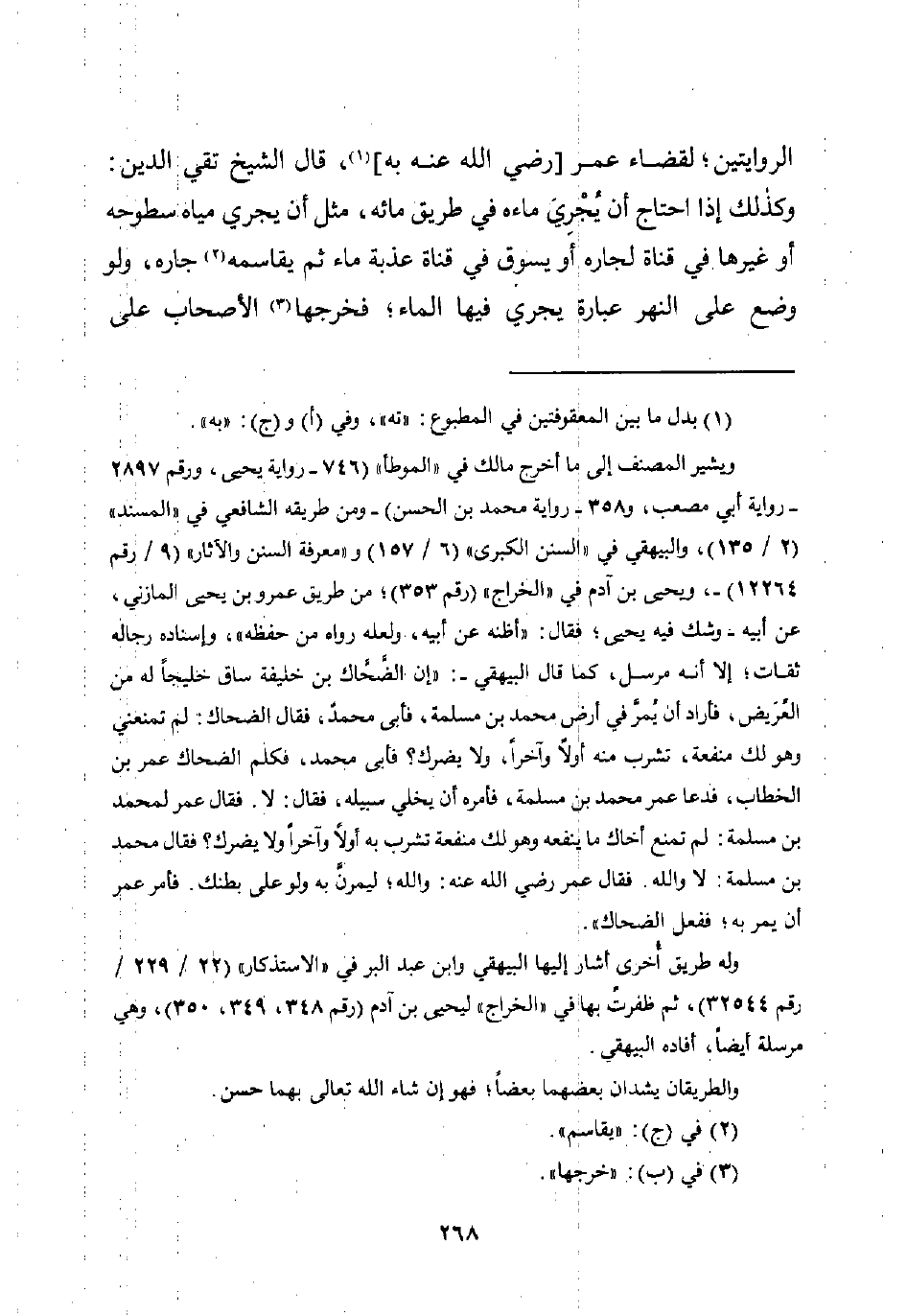 ويشير المصنف إلى ما أخرج مالك في "الموطأ" (746 - رواية يحيى، ورقم 2897 - رواية أبي مصعب، و 358 - رواية محمد بن الحسن) -ومن طريقه الشافعي في "المسند" (2/ 135)، والبيهقي في "السنن الكبرى" (6/ 157) و"معرفة السنن والآثار" (9/ رقم 12264) -، ويحيى بن آدم في "الخراج" (رقم 353)؛ من طريق عمرو بن يحيى المازني، عن أبيه -وشك فيه يحيى، فقال: "أظنه عن أبيه، ولعله رواه من حفظه"، بإسناده رجاله ثقات؛ إلا أنه مرسل، كما قال البيهقي-: "إن الضَّحَّاك بن خليفة ساق خليجًا له من العُرَيض، فأراد أن يُمرَّ في أرض محمد بن مسلمة، فأبى محمدّ، فقال الضحاك: لم تمنعني وهو لك منفعة، تشرب منه أولًا وآخرًا، ولا يضرك؟ فأبى محمد، فكلم الضحاك عمر بن الخطاب، فدعا عمر محمد بن سلمة، فأمره أن يخلي سبيله، فقال: لا. فقال عمر لمحمد بن مسلمة: لم تمنع أخاك ما ينفعه وهو لك منفعة تشرب به أولًا وآخرًا ولا يضرك؟ فقال محمد بن مسلمة: لا واللَّه. فقال عمر رضي اللَّه عنه: واللَّه، لِيمرنَّ به ولو على بطنك. فأمر عمر أن يمر به؛ ففعل الضحاك".