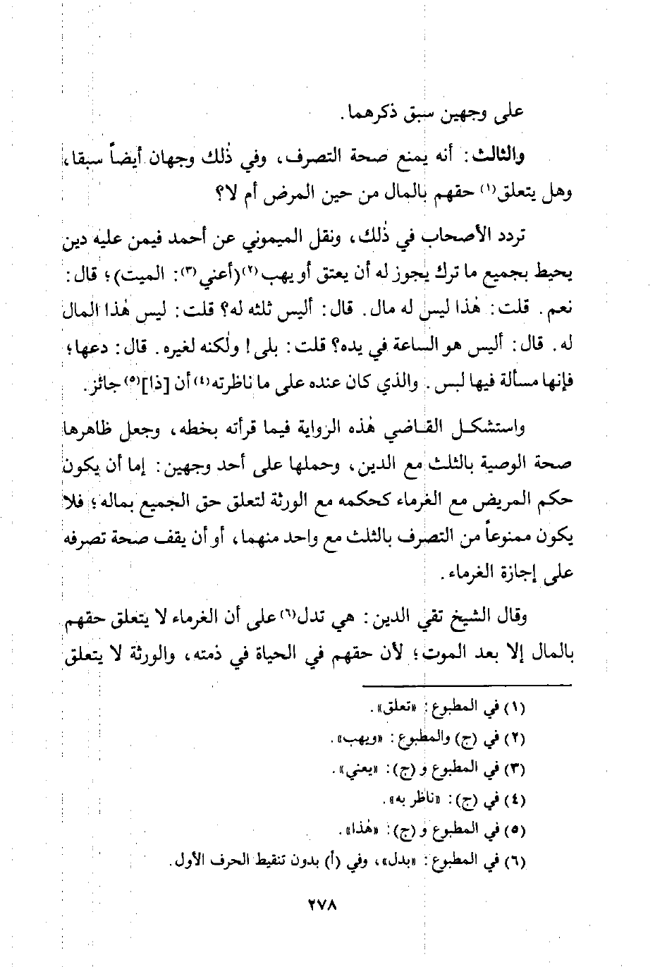 واستشكل القاضي هذه الرواية فيما قرأته بخطه، وجعل ظاهرها صحة الوصية بالثلث مع الدين، وحملها على أحد وجهين: إما أن يكون حكم المريض مع الغرماء كحكمه مع الورثة لتعلق حق الجميع بماله؛ فلا يكون ممنوعًا من التصرف بالشك مع واحد منهما، أو أن يقف صحة تصرفه على إجازة الغرماء.