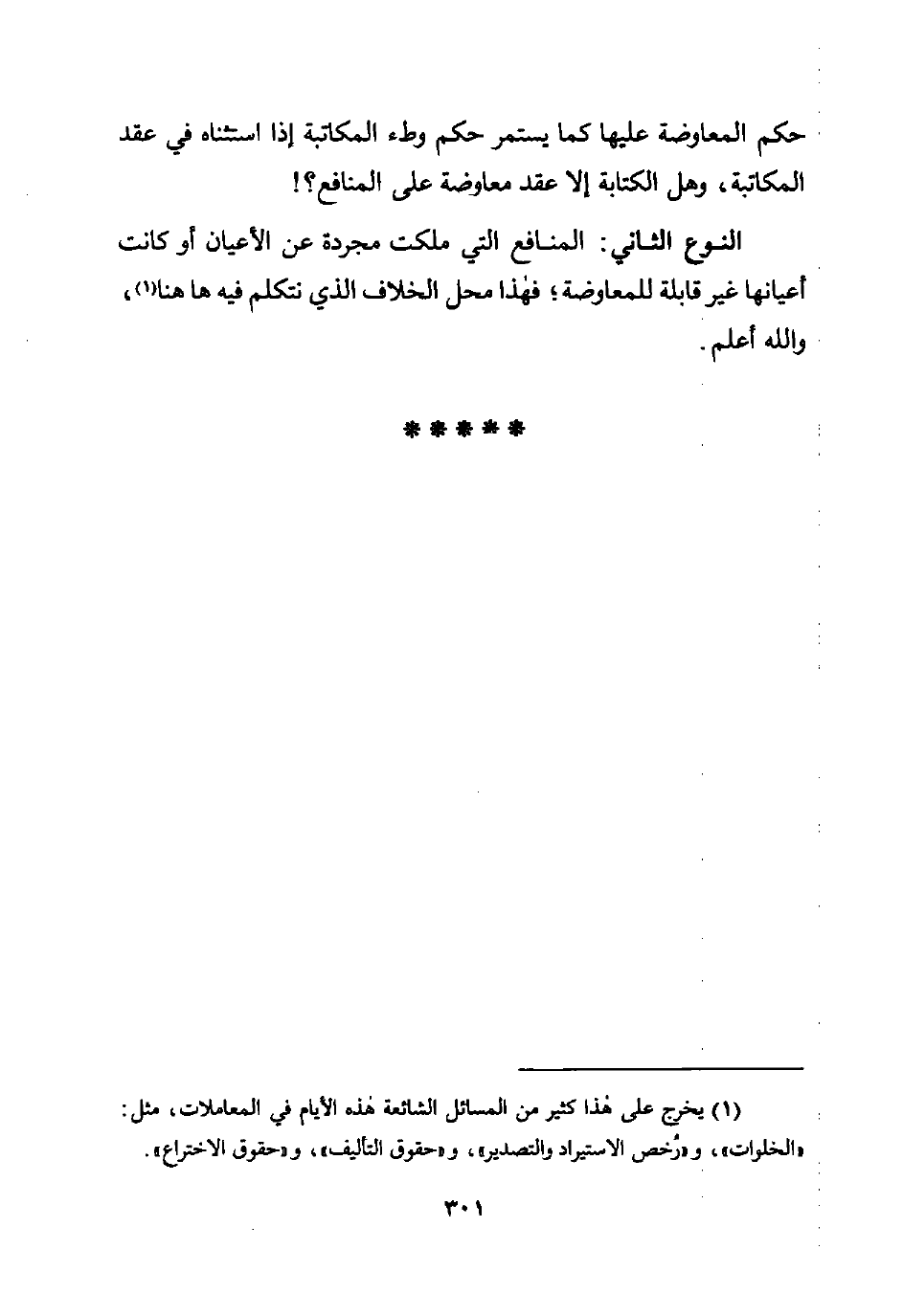 (¬1) يخرج على هذا كثير من المسائل الشائعة هذه الأيام في المعاملات، مثل: "الخلوات"، و"رُخص الاستيراد والتصدير"، و"حقوق التأليف" و"حقوق الاختراع".