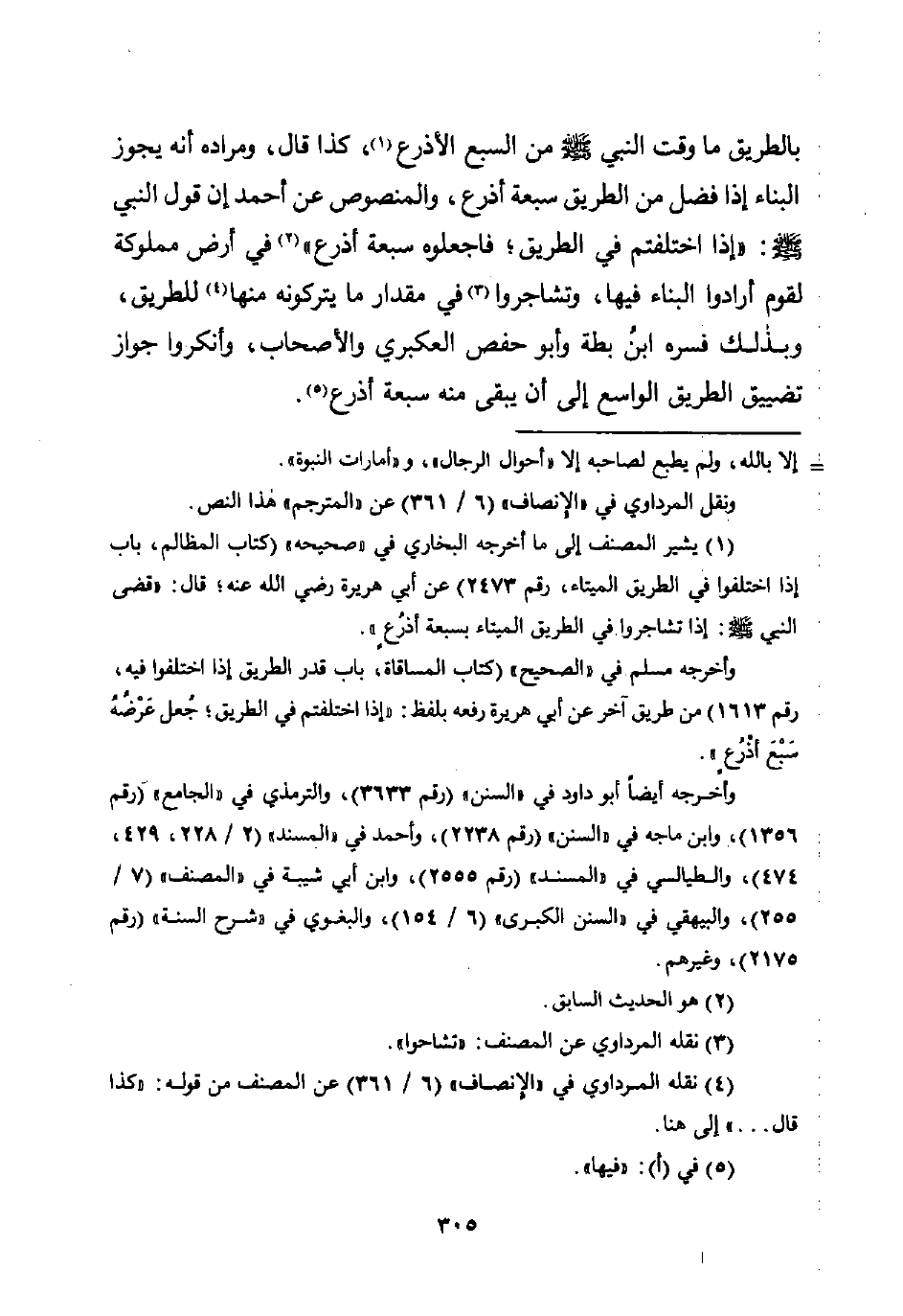 (¬1) يشير المصنف إلى ما أخرجه البخاري في "صحيحه" (كتاب المظالم، باب إذا اختلفوا في الطريق الميتاء، رقم 2473) عن أبي هريرة رضي اللَّه عنه؛ قال: "قضى النبي -صلى اللَّه عليه وسلم-: إذا تشاجروا في الطريق الميناء بسبعة أذرُعٍ".