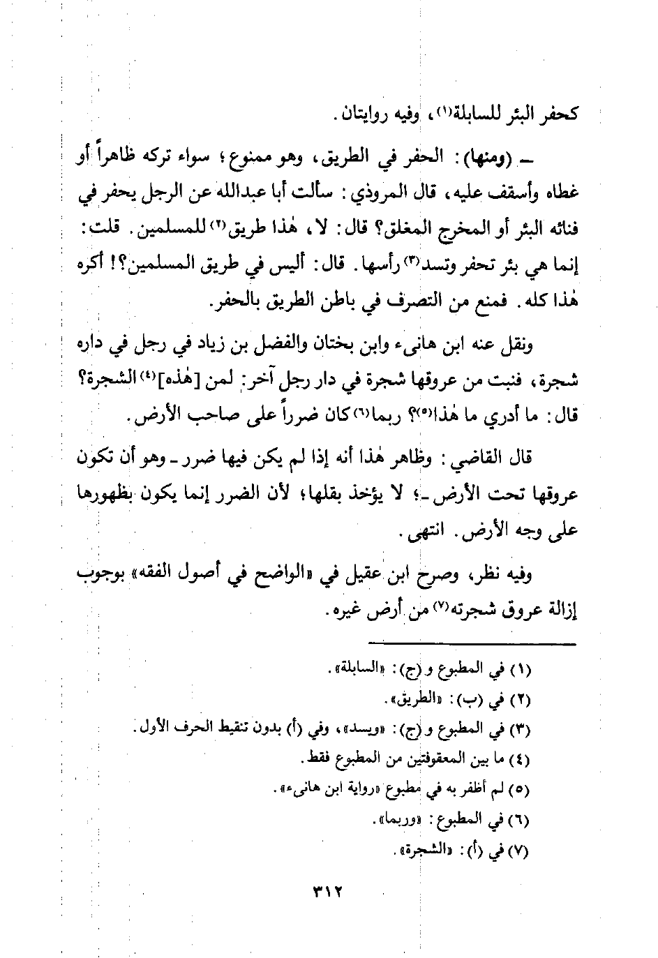 - (ومنها): الحفر في الطريق، وهو ممنوع؛ سواء تركه ظاهرًا أو غطاه وأسقف عليه، قال المروذي: سألت أبا عبد اللَّه عن الرجل يحفر في فنائه البئر أو المخرج المغلق؟ قال: لا، هذا طريق (¬2) للمسلمين. قلت: إنما هي بئر تحفر وتسد (¬3) رأسها. قال: أليس في طريق المسلمين؟! أكره هذا كله. فمنع من التصرف في باطن الطريق بالحفر.