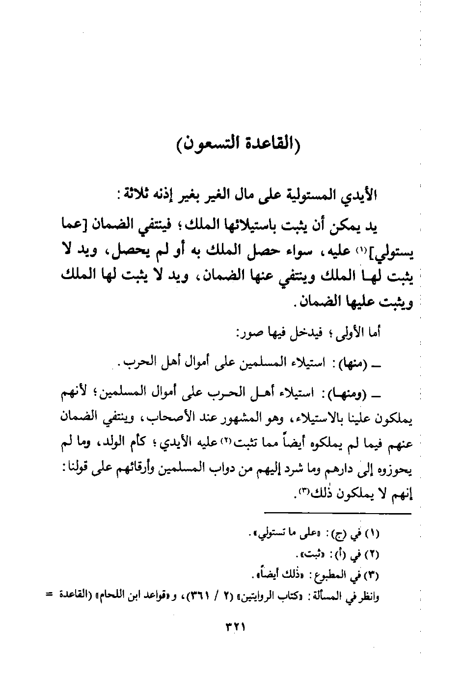 - (ومنها): استيلاء أهل الحرب على أموال المسلمين؛ لأنهم يملكون علينا بالاستيلاء، وهو المشهور عند الأصحاب، وينتفي الضمان عنهم فيما لم يملكوه أيضًا مما تثبت (¬2) عليه الأيدي؛ كأم الولد، وما لم يحوزوه إلى دارهم وما شرد إليهم من دواب المسلمين وأرقائهم على قولنا: انهم لا يملكون ذلك (¬3).