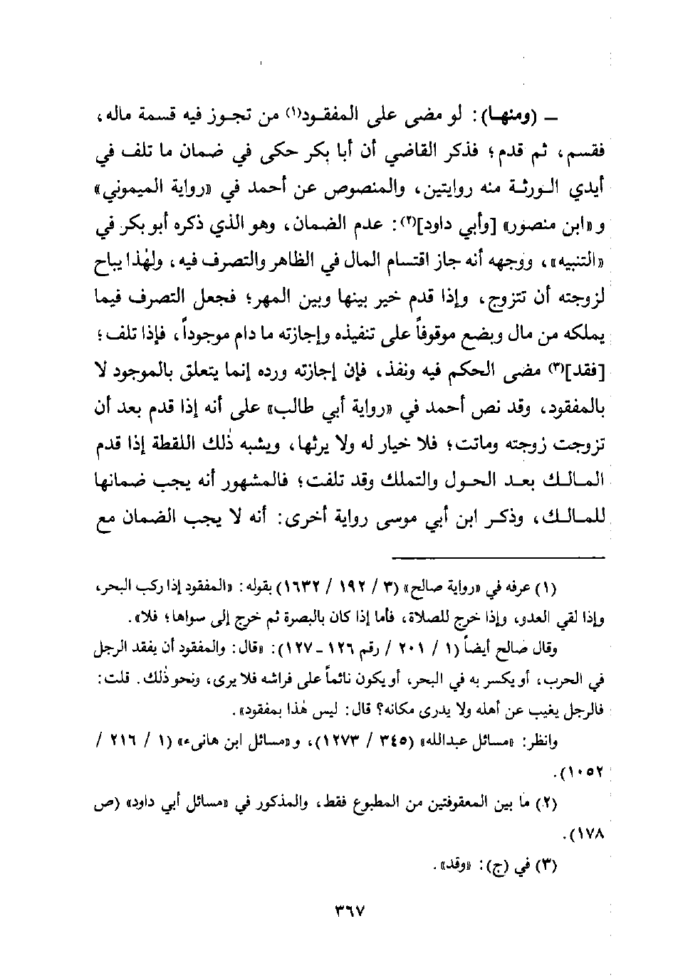 (¬1) عرفه في "رواية صالح" (3/ 192/ 1632) بقوله: "المفقود إذا ركب البحر، وإذا لقي العدو، وإذا خرج للصلاة، فأما إذا كان بالبصرة ثم خرج إلى سواها؛ فلا".