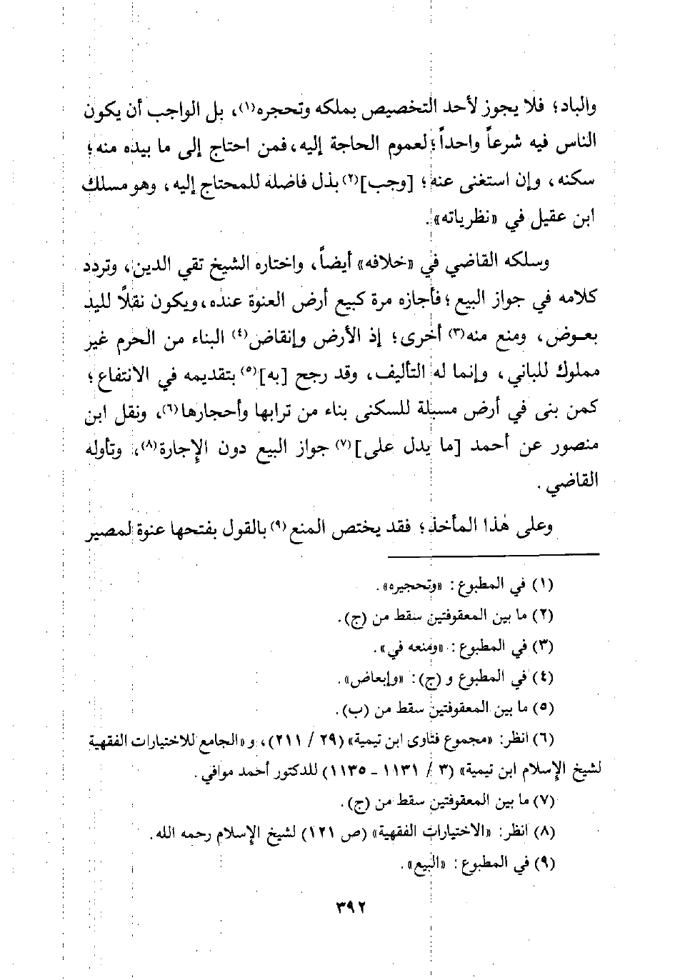 والباد؛ فلا يجوز لأحد التخصيص بملكه وتحجره (¬1)، بل الواجب أن يكون الناس فيه شرعًا واحدًا؛ لعموم الحاجة إليه، فمن احتاج إلى ما بيده منه؛ سكنه، وإن استغنى عنه؛ [وجب] (¬2) بذل فاضله للمحتاج إليه، وهو مسلك ابن عقيل في "نظرياته".