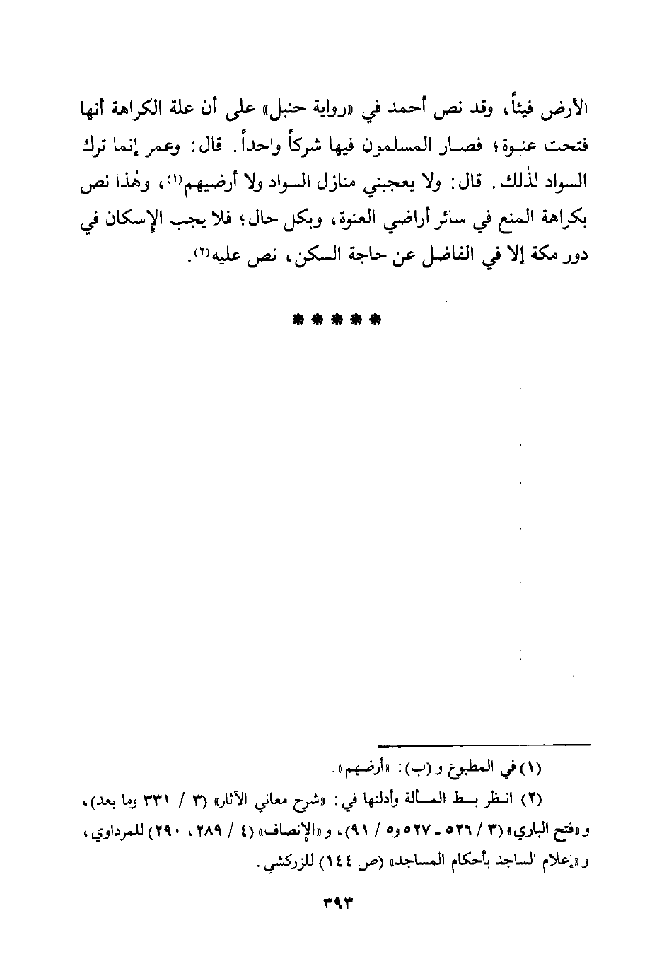 الأرض فيئًا، وقد نص أحمد في "رواية حنبل" على أن علة الكراهة أنها فتحت عنوة؛ فصار المسلمون فيها شركًا واحدًا. قال: وعمر إنما ترك السواد لذلك. قال: ولا يعجبني منازل السواد ولا أرضيهم (¬1)، وهذا نص بكراهة المنع في سائر أراضي العنوة، وبكل حال؛ فلا يجب الإسكان في دور مكة إلا في الفاضل عن حاجة السكن، نص عليه (¬2).