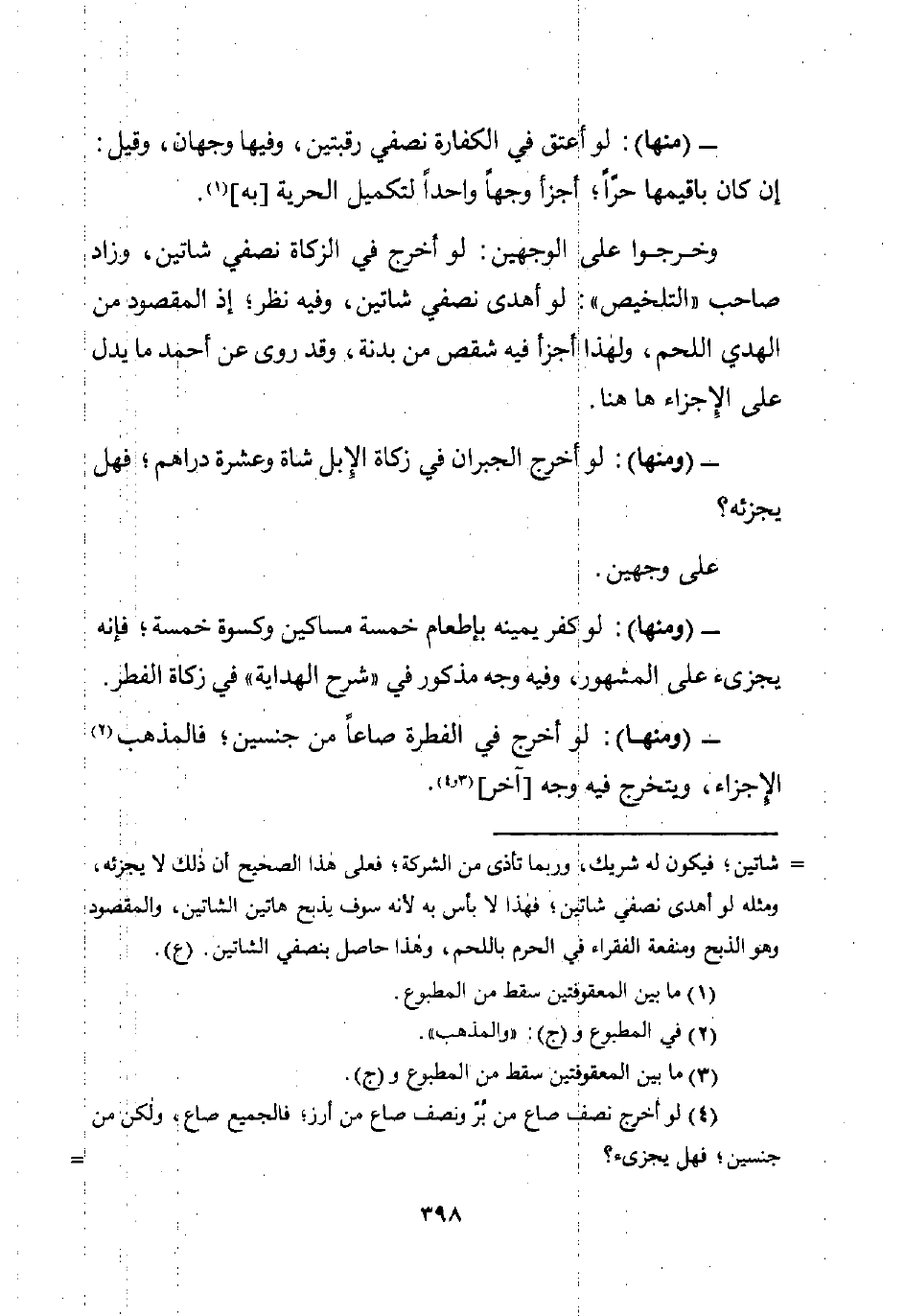 - (ومنها): لو أخرج الجبران في زكاة الإِبل شاة وعشرة دراهم؛ فهل يجزئه؟