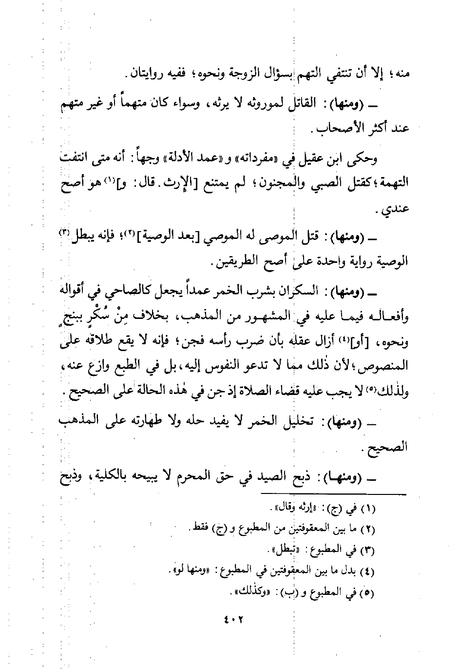 - (ومنها): تخليل الخمر لا يفيد حله ولا طهارته على المذهب الصحيح.