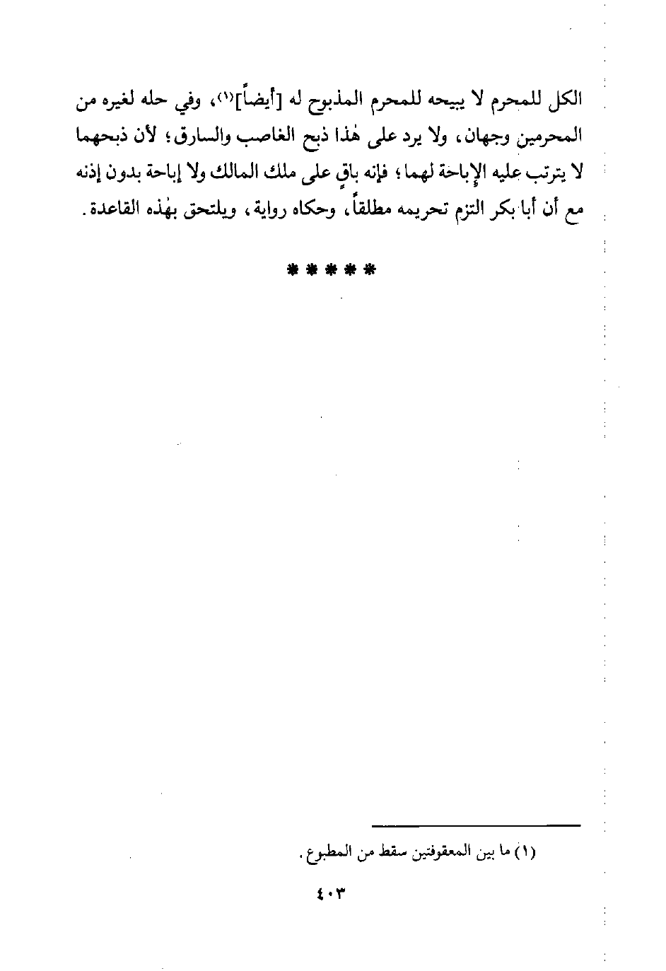 الكل للمحرم لا يبيحه للمحرم المذبوح له [أيضًا] (¬1)، وفي حله لغيره من المحرمين وجهان، ولا يرد على هذا ذبح الغاصب والسارق؛ لأن ذبحهما لا يترتب عليه الأباحة لهما؛ فإنه باقٍ على ملك المالك ولا إباحة بدون إذنه مع أن أبا بكر التزم تحريمه مطلقًا، وحكاه رواية، ويلتحق بهذه القاعدة.
