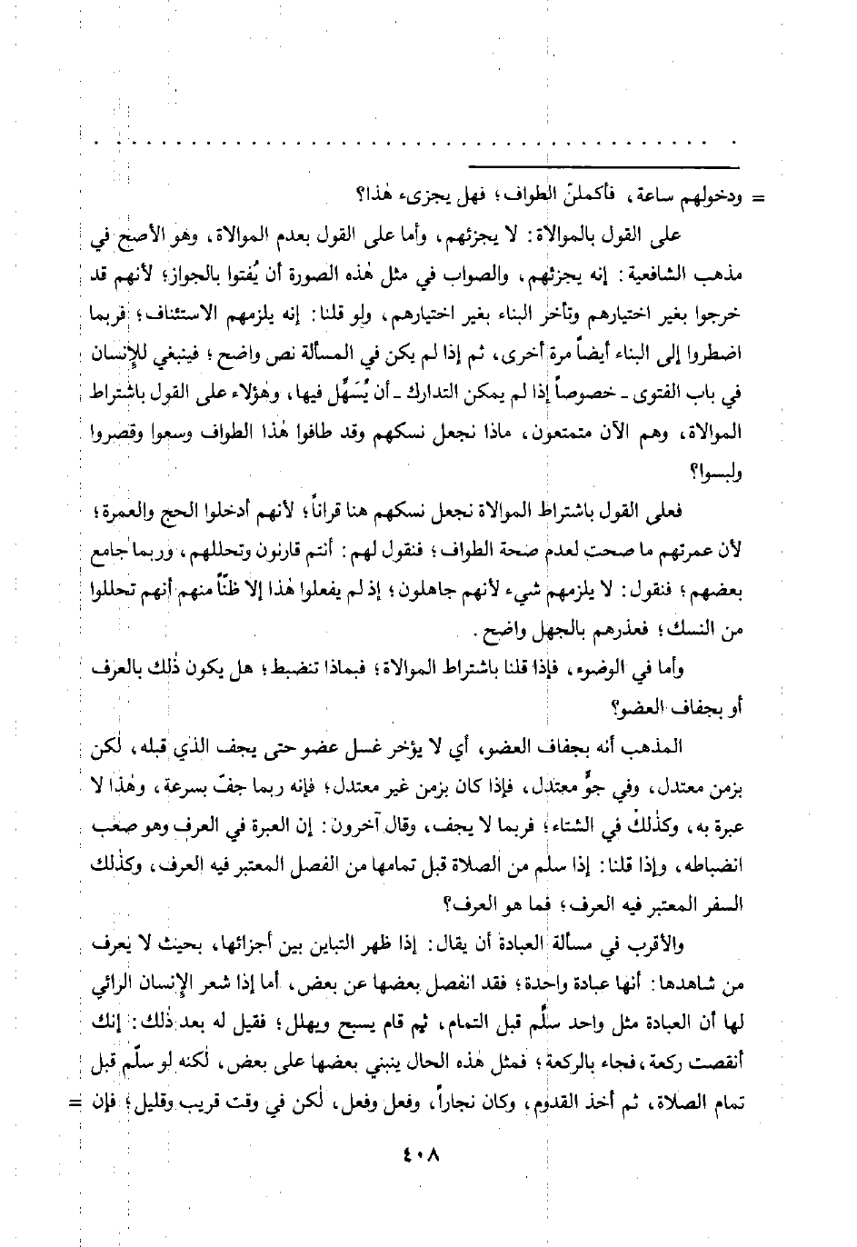 والأقرب في مسألة العبادة أن يقال: إذا ظهر التباين بين أجزائها، بحيث لا يعرف من شاهدها: أنها عادة واحدة؛ فقد انفصل بعضها عن بعض، أما إذا شعر الإنسان الرائي لها أن العبادة مثل واحد سلَّم قبل التمام، ثم قام يسبح ويهلل؛ فقيل له بعد ذلك: إنك أنقصت ركعة، فجاء بالركعة، فمثل هذه الحال ينبني بعضها على بعض، لكنه لو سلّم قبل تمام الصلاة، ثم أخذ القدوم، وكان نجارًا، وفعل وفعل، لكن في وقت قريب وقليل؛ فإن =