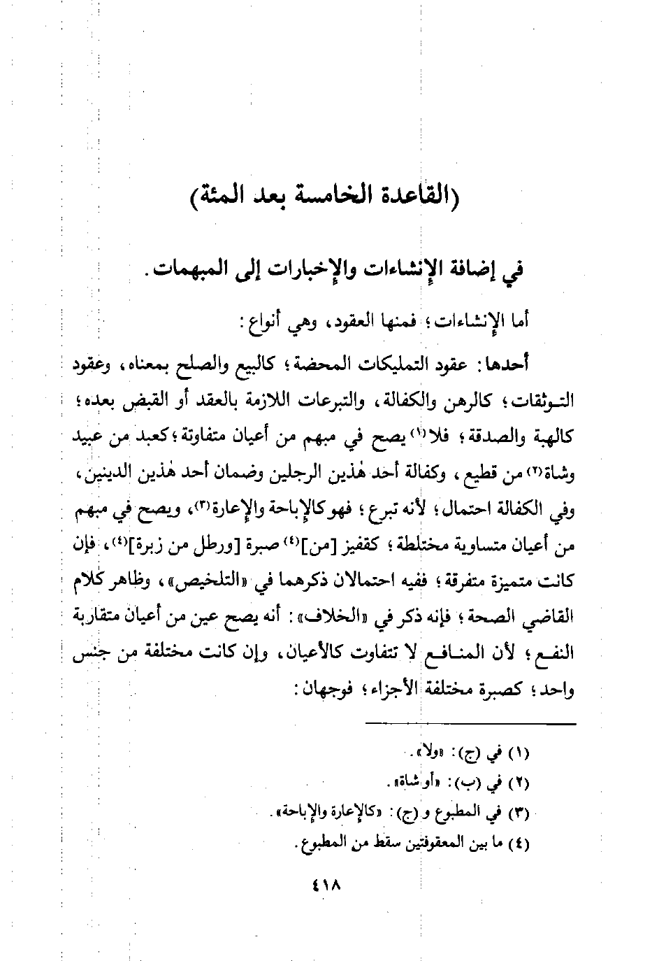 أحدها: عقود التمليكات المحضة؛ كالبيع والصلح بمعناه، وعقود التوثقات؛ كالرهن والكفالة، والتبرعات اللازمة بالعقد أو القبض بعده؛ كالهبة والصدقة؛ فلا (¬1) يصح في مبهم من أعيان متفاوتة؛ كعبد من عبيد وشاة (¬2) من قطيع، وكفالة أحد هذين الرجلين وضمان أحد هذين الدينين، وفي الكفالة احتمال؛ لأنه تبرع؛ فهو كالإباحة والإعارة (¬3)، ويصح في مبهم من أعيان متساوية مخنلطة؛ كقفيز [من] (4) صبرة [ورطل من زبرة] (¬4)، فإن كانت متميزة متفرقة؛ ففيه احتمالان ذكرهما في "التلخيص"، وظاهر كلام القاضي الصحة؛ فإنه ذكر في "الخلاف": أنه يصح عين من أعيان متقاربة النفع؛ لأن المنافع لا تتفاوت كالأعيان، وإن كانت مختلفة من جنس واحد؛ كصبرة مختلفة الأجزاء؛ فوجهان: