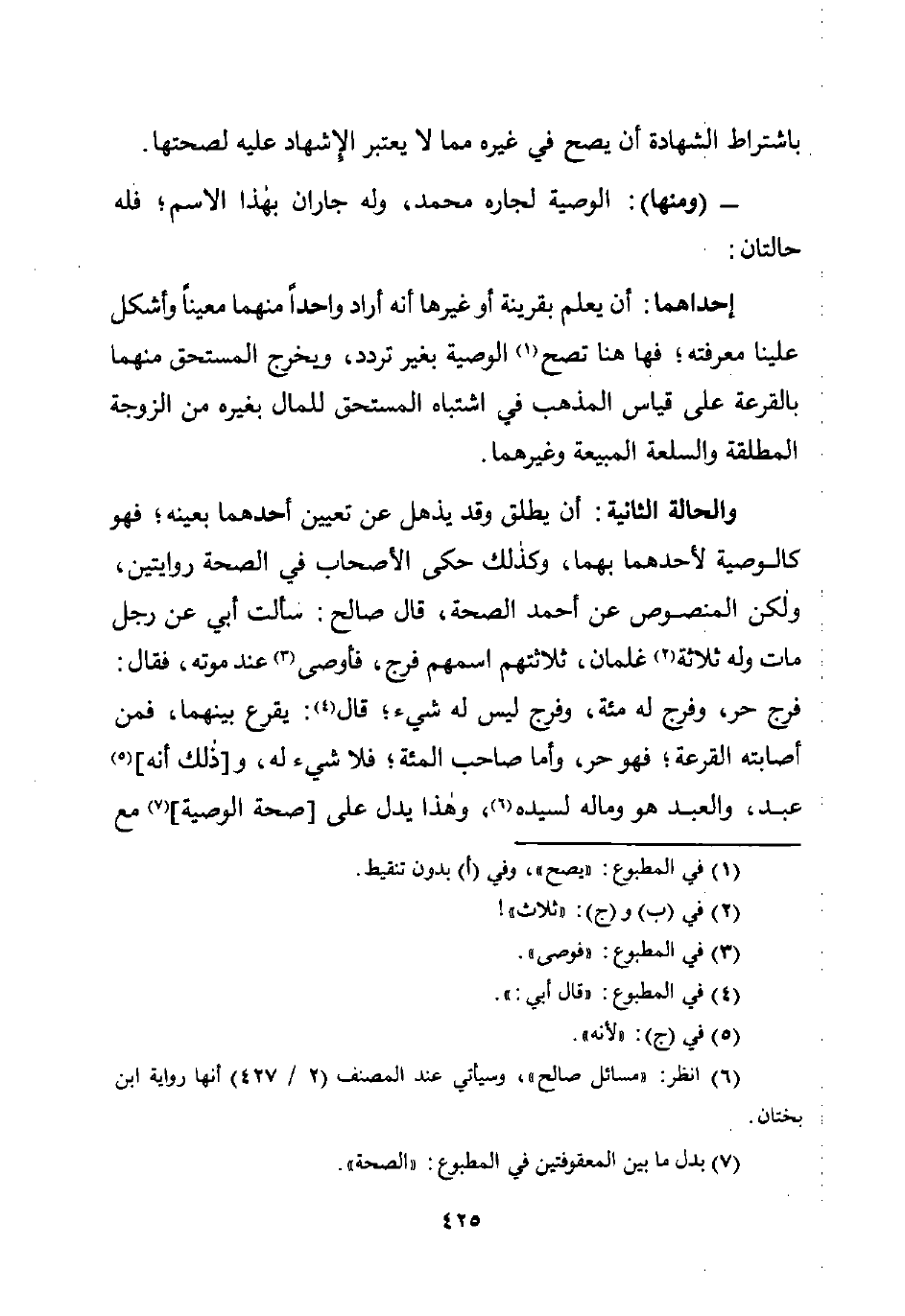 والحالة الثانية: أن يطلق وقد يذهل عن تعيين أحدهما بعينه؛ فهو كالوصية لأحدهما بهما، وكذلك حكى الأصحاب في الصحة روايتين، ولكن المنصوص عن أحمد الصحة، قال صالح: سألت أبي عن رجل مات وله ثلاثة (¬2) غلمان، ثلاثتهم اسمهم فرج، فأوصى (¬3) عند موته، فقال: فرج حر، وفرج له مئة، وفرج ليس له شيء؛ قال (¬4): يقرع بينهما، فمن أصابته القرعة؛ فهو حر، وأما صاحب المئة؛ فلا شيء له، و [ذلك أنه] (¬5) عبد، والعبد هو وماله لسيده (¬6)، وهذا يدل على [صحة الوصية] (¬7) مع