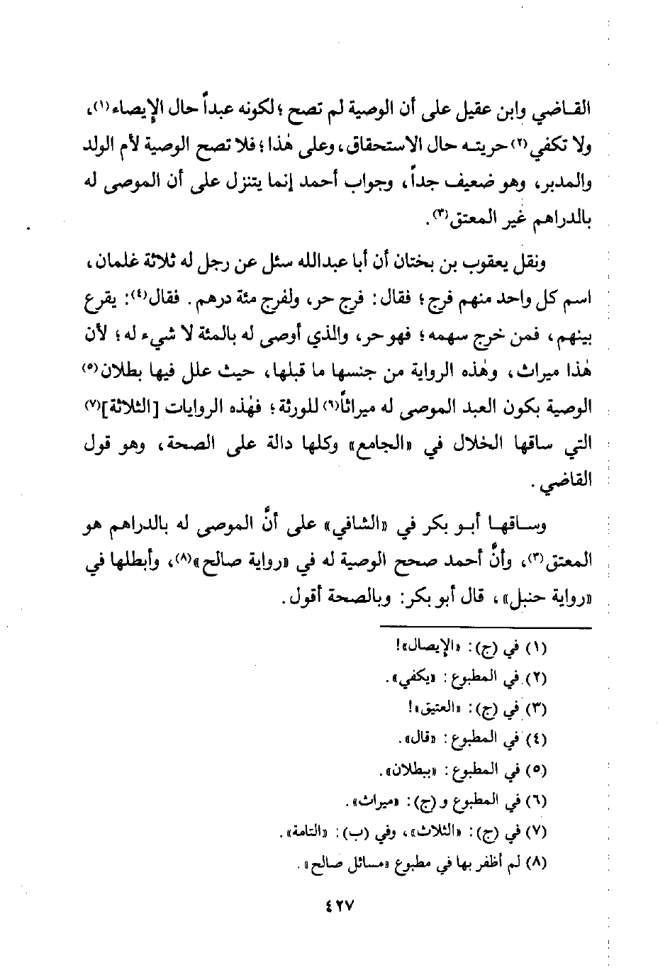 وساقها أبو بكر في "الشافي" على أنَّ الموصى له بالدراهم هو المعتق (3)، وأنَّ أحمد صحيح الوصية له في "رواية صالح" (¬8)، وأبطلها في "رواية حنبل"، قال أبو بكر: وبالصحة أقول.