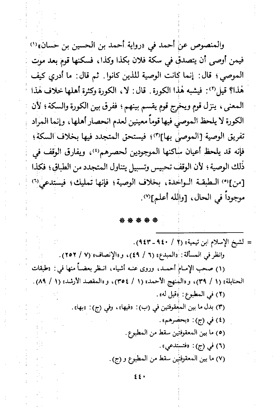 والمنصوص عن أحمد في "رواية أحمد بن الحسين بن حسان" (¬1) فيمن أوصى أن يتصدق في سكة فلان بكذا وكذا، فسكنها قوم بعد موت الموصي؛ قال: إنما كانت الوصية للذين كانوا. ثم قال: ما أدري كيف هذا؟ قيل (¬2): فيثبه هذا الكورة. قال: لا، الكورة وكثرة أهلها خلاف هذا المعنى، ينزل قوم ويخرج قوم يقسم بينهم؛ ففرق بين الكورة والسكة؛ لأن الكورة لا يلحظ الموصي فيها قومًا معينين لعدم انحصار أهلها، وإنما المراد تفريق الوصية [الموصى بها] (¬3)؛ فيستحق المتجدد فيها بخلاف السكة؛ فإنه قد يلحظ أعيان ساكنها الموجودين لحصرهم (¬4)، ويفارق الوقف في ذلك الوصية، لأن الوقف تحبيس وتسبيل يتناول المتجدد من الطباق؛ فكذا [من] (¬5) الطبقة الواحدة، بخلاف الوصية؛ فإنها تمليك؛ فيستدعي (¬6) موجودًا في الحال، [واللَّه أعلم] (¬7).
