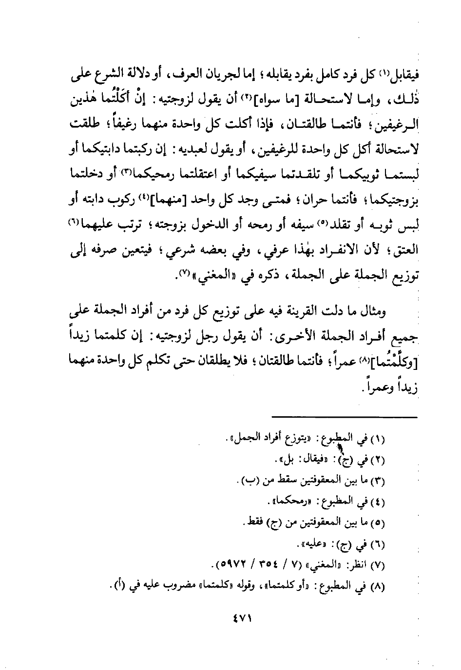 فيقابل (¬1) كل فرد كامل بفرد يقابله؛ إما لجريان العرف، أو دلالة الشرع على ذلك، وإما لاستحالة [ما سواه] (¬2) أن يقول لزوجتيه: إن أكَلْتُما هذين الرغيفين؛ فأنتما طالقتان، فإذا أكلت كل واحدة منهما رغيفًا؛ طلقت لاستحالة أكل كل واحدة للرغيفين، أو يقول لعبديه: إن ركبتما دابتيكما أو لبستما ثوبيكما أو تلقدتما سيفيكما أو اعتقلتما رمحيكما (¬3) أو دخلتما بزوجتيكما؛ فأنتما حران؛ فمتى وجد كل واحد [منهما] (¬4) ركوب دابته أو لبس ثوبه أو تقلد (¬5) سيفه أو رمحه أو الدخول بزوجته؛ ترتب عليهما (¬6) العتق؛ لأن الانفراد بهذا عرفي، وفي بعضه شرعي؛ فيتعين صرفه إلى توزيع الجملة على الجملة، ذكره في "المغني" (¬7).