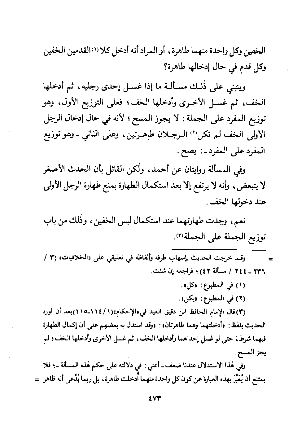 (¬3) قال الإمام الحافظ ابن دقيق العيد في "الإحكام" (1/ 114 - 115) بعد أن أورد الحديث بلفظ: "أدخلتهما وهما طاهرتان": "وقد استدل به بعضهم على أن إكمال الطهارة فيهما شرط، حتى لو غسل إحداهما وأدخلها الخف، ثم غسل الأخرى وأدخلها الخف؛ لم يجز المسح.