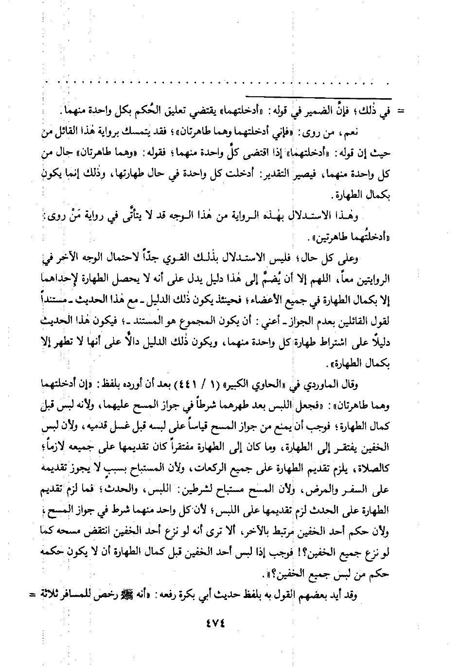 وقال الماوردي في "الحاوي الكبير" (1/ 441) بعد أن أورده بلفظ: "إن أدخلتهما وهما طاهرتان": "فجعل اللبس بعد طهرهما شرطًا في جواز المسح عليهما، ولأنه لبس قبل كمال الطهارة؛ فوجب أن يمنع من جواز المسح قياسًا على لبسه قبل غسل قدميه، ولأن لبس الخفين يفتقر إلى الطهارة، وما كان إلى الطهارة مفتقرًا كان تقديمها على جميعه لازمًا؛ كالصلاة، يلزم تقديم الطهارة على جميع الركعات، ولأن المستباح بسبب لا يجوز تقديمه على السفر والمرض، ولأن المسح مستباح لشرطين: اللبس، والحدث؛ فما لزم تقديم الطهارة على الحدث لزم تقديمها على اللبس، لأن كل واحد منهما شرط في جواز المسح، ولأن حكم أحد الخفين مرتبط بالآخر، ألا ترى أنه لو نزع أحد الخفين اننقض مسحه كما لو نزع جميع الخفين؟! فوجب إذا لبس أحد الخفين قبل كمال الطهارة أن لا يكون حكمه حكم من لبس جميع الخفين؟ ".