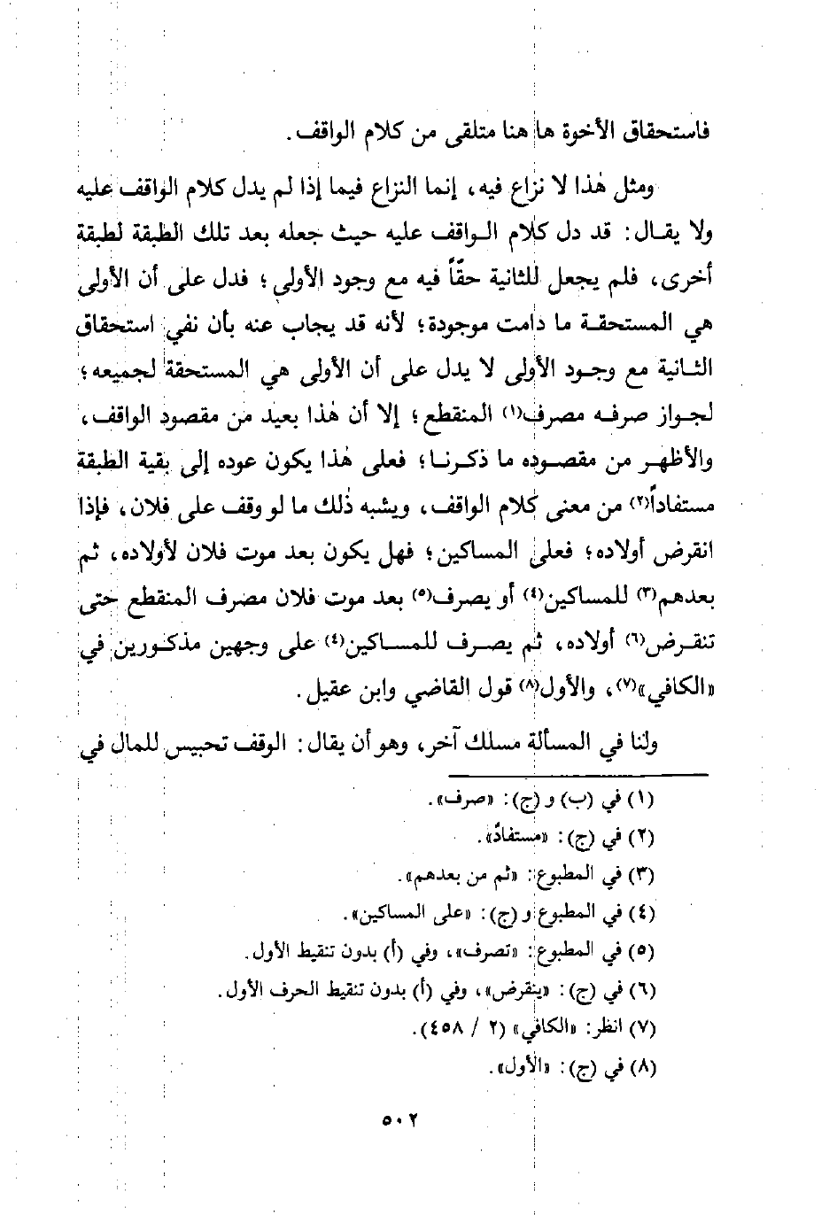 ومثل هذا لا نزاع فيه، إنما النزاع فيما إذا لم يدل كلام الواقف عليه ولا يقال: قد دل كلام الواقف عليه حيث جعله بعد تلك الطبقة لطبقة أخرى، فلم يجعل للثانية حقًّا فيه مع وجود الأولي؛ فدل على أن الأولى هي المستحقة ما دامت موجودة؛ لأنه قد يجاب عنه بأن نفي استحقاق الثانية مع وجود الأولى لا يدل على أن الأولى هي المستحقة لجميعه؛ لجواز صرفه مصرف (¬1) المنقطع؛ إلا أن هذا بعيد من مقصود الواقف، والأظهر من مقصوده ما ذكرنا؛ فعلى هذا يكون عوده إلى بقية الطبقة مستفادًا (¬2) من معنى كلام الواقف، ويشبه ذلك ما لو وقف على فلان، فإذا انقرض أولاده؛ فعلى المساكين؛ فهل يكون بعد موت فلان لأولاده، ثم بعدهم (¬3) للمساكين (¬4) أو يصرف (¬5) بعد موت فلان مصرف المنقطع حتى تنقرض (¬6) أولاده، ثم يصرف للمساكين (4) على وجهين مذكورين في "الكافي" (¬7)، والأول (¬8) قول القاضي وابن عقيل.
