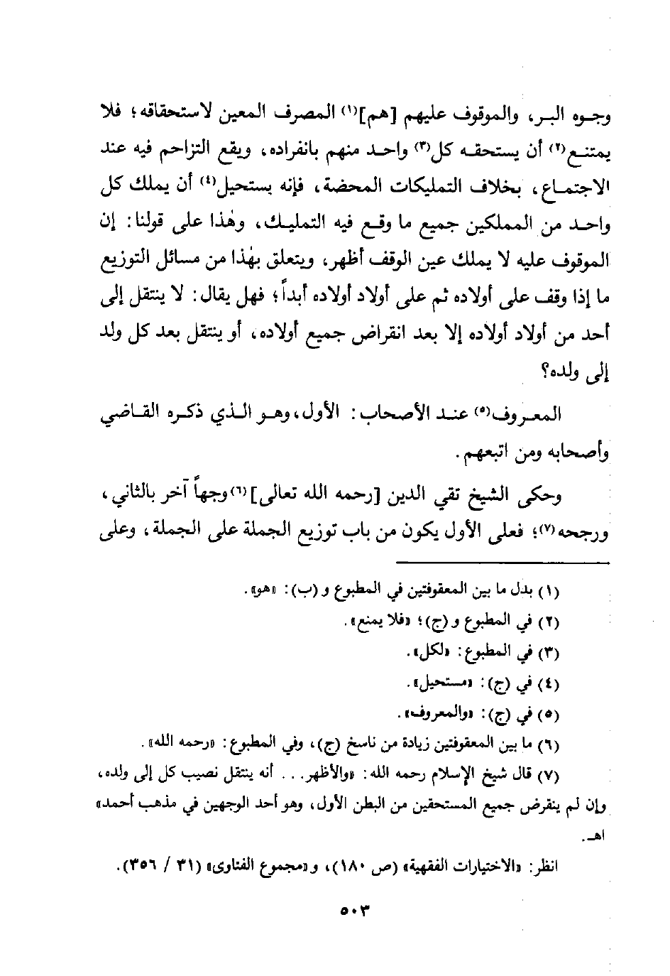(¬7) قال شيخ الإسلام رحمه اللَّه: "والأظهر. . . أنه ينتقل نصب كل إلى ولده، وإن لم ينقرض جميع المستحقين من البطن الأول، وهو أحد الوجهين في مذهب أحمد" اهـ.