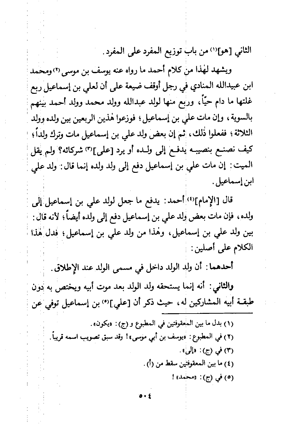 قال [الإمام] (¬4) أحمد: يدفع ما جعل لولد علي بن إسماعيل إلى ولده، فإن مات بعض ولد علي بن إسماعيل دفع إلى ولده أيضًا؛ لأنه قال: بين ولد علي بن إسماعيل، وهذا من ولد علي بن إسماعيل؛ فدل هذا الكلام على أصلين: