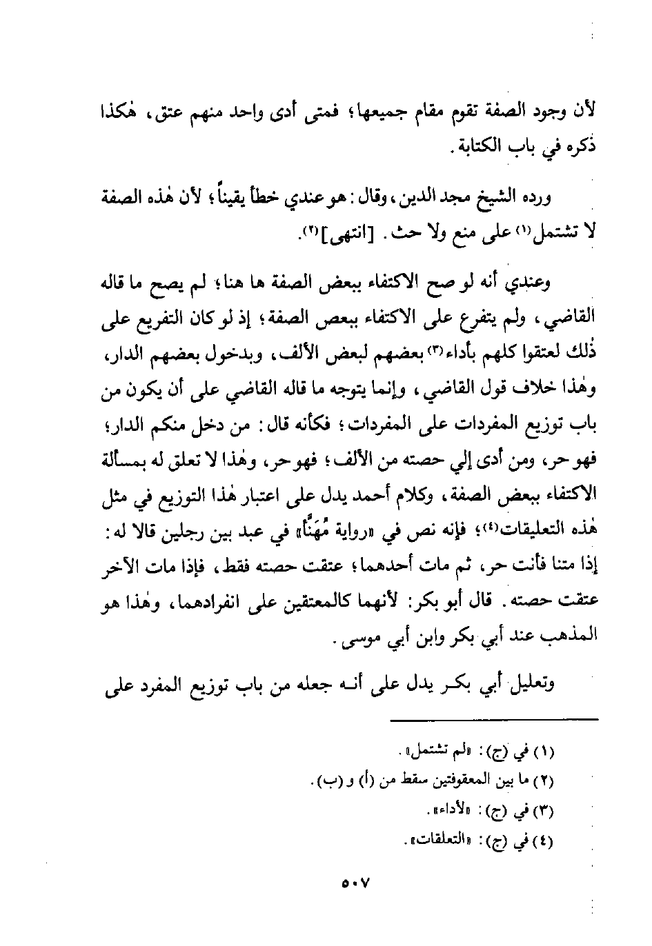 وعندي أنه لو صح الاكتفاء ببعض الصفة ها هنا؛ لم يصح ما قاله القاضي، ولم يتفرع على الاكتفاء ببعص الصفة؛ إذ لو كان التفريع على ذلك لعتقوا كلهم بأداء (¬3) بعضهم لبعض الألف، وبدخول بعضهم الدار، وهذا خلاف قول القاضي، وإنما يتوجه ما قاله القاضي على أن يكون من باب توزيع المفردات على المفردات؛ فكأنه قال: من دخل منكم الدار؛ فهو حر، ومن أدى إلي حصته من الألف؛ فهو حر، وهذا لا تعلق له بمسألة الاكتفاء ببعض الصفة، وكلام أحمد يدل على اعتبار هذا التوزيع في مثل هذه التعليقات (¬4)؛ فإنه نص في "رواية مُهَنَّأ" في عبد بين رجلين قالا له: إذا متنا فأنت حر، ثم مات أحدهما؛ عتقت حصته فقط، فإذا مات الآخر عتقت حصته. قال أبو بكر: لأنهما كالمعتقين على انفرادهما، وهذا هو المذهب عند أبي بكر وابن أبي موسى.
