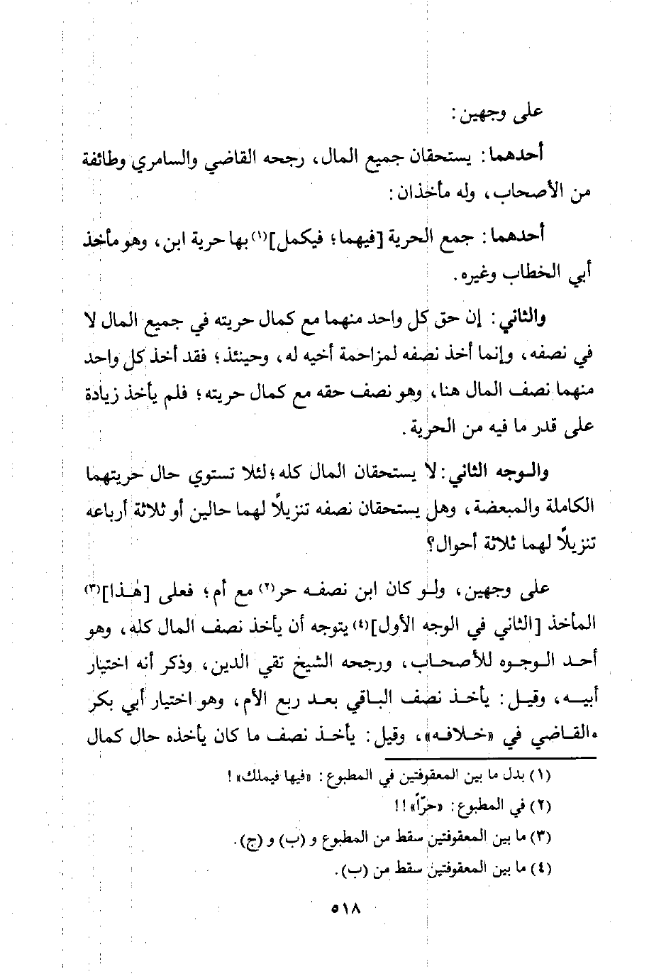 والثاني: إن حق كل واحد منهما مع كمال حريته في جميع المال لا في نصفه، وإنما أخذ نصفه لمزاحمة أخيه له، وحينئذ؛ فقد أخذ كل واحد منهما نصف المال هنا، وهو نصف حقه مع كمال حريته؛ فلم يأخذ زيادة على قدر ما فيه من الحرية.