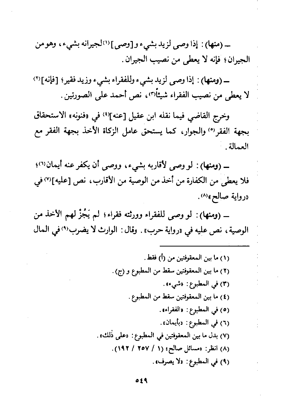 - (ومنها): إذا وصى لزيد بشيء وللفقراء بشيء وزيد فقير؛ [فإنه] (¬2) لا يعطى من نصيب الفقراء شيئًا (¬3)، نص أحمد على الصورتين.