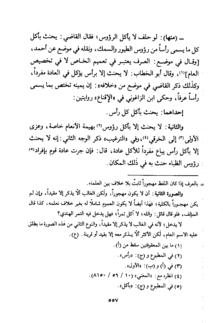 - (منها): لو حلف لا يأكل الرؤوس؛ فقال القاضي: يحنث بأكل كل ما يسمى رأسًا من رؤوس الطيور والسمك، ونقله في موضع عن أحمد، [وقال في موضع: العرف يعتبر في تعميم الخاص لا في تخصيص العام] (¬1)، وقال أبو الخطاب: لا يحنث إلا برأس يؤكل في العادة مفردًا، وكذلك ذكر القاضي في موضع من "خلافه": إن يمينه تختص بما يسمى رأسًا عرفًا، وحكى ابن الزاغوني في "الإِقناع" روايتين: