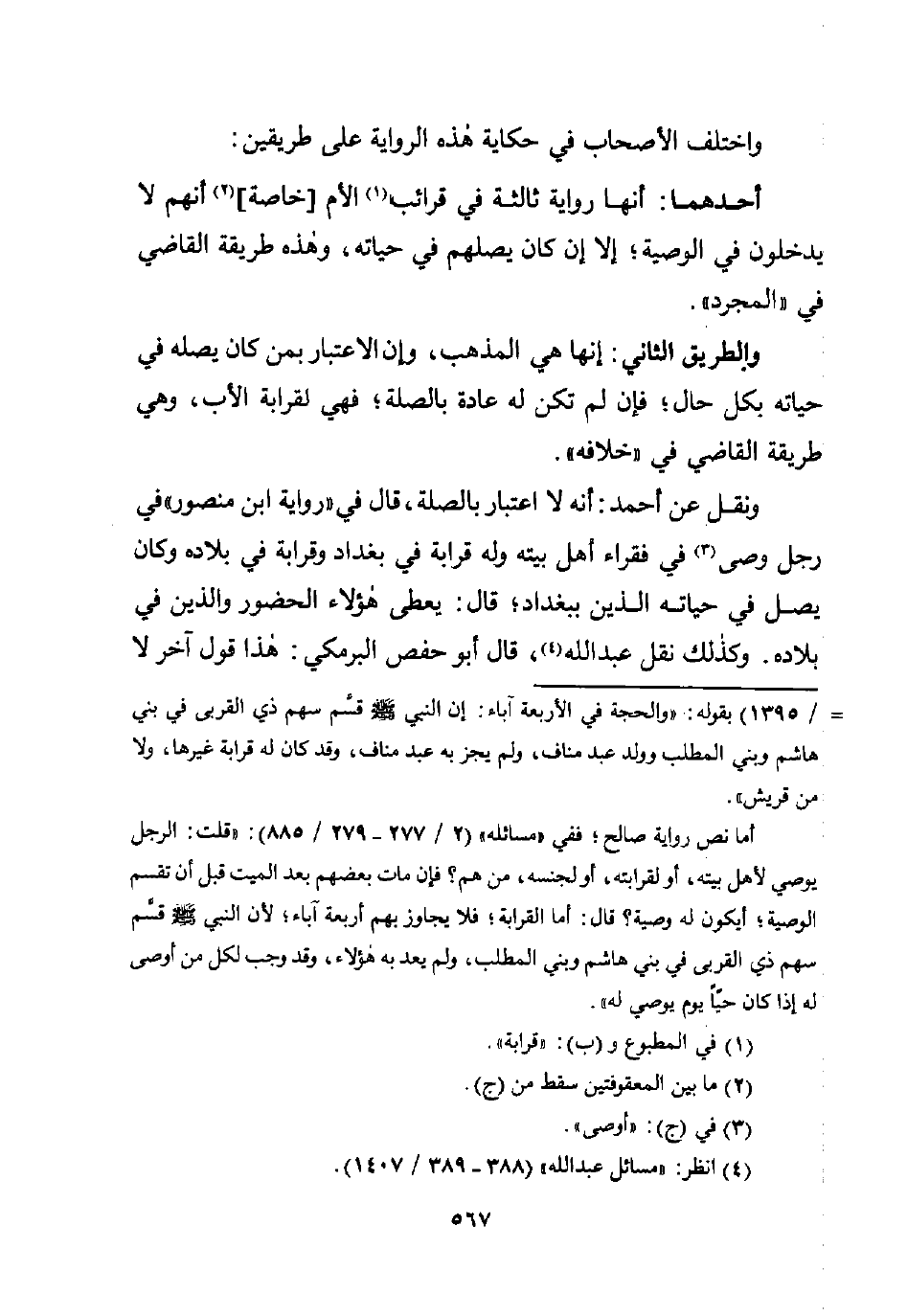 أما نص رواية صالح؛ ففي "مسائله" (2/ 277 - 279/ 885): "قلت: الرجل يوصي لأهل بيته، أو لقرابته، أو لجنسه، من هم؟ فإن مات بعضهم بعد الميت قبل أن تقسم الوصية؛ أيكون له وصية؟ قال: أما القرابة؛ فلا يجاوز بهم أربعة آباء، لأن النبي -صلى اللَّه عليه وسلم- قسَّم سهم ذي القربى في بني هاشم وبني المطلب، ولم يعد به هؤلاء، وقد وجب لكل من أوصى له إذا كان حيًّا يوم يوصي له".