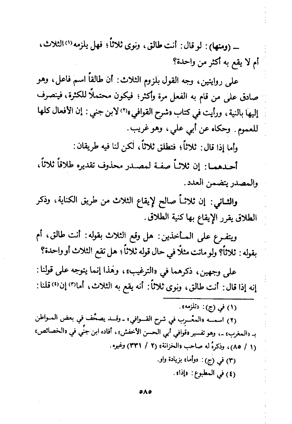 على روايتين، وجه القول بلزوم الثلاث: أن طالقًا اسم فاعل، وهو صادق على من قام به الفعل مرة وأكثر، فيكون محتملًا للكثرة، فينصرف إليها بالنية، ورأيت في كتاب "شرح القوافي" (¬2) لابن جني: إن الأفعال كلها للعموم. وحكاه عن أبي علي، وهو غريب.