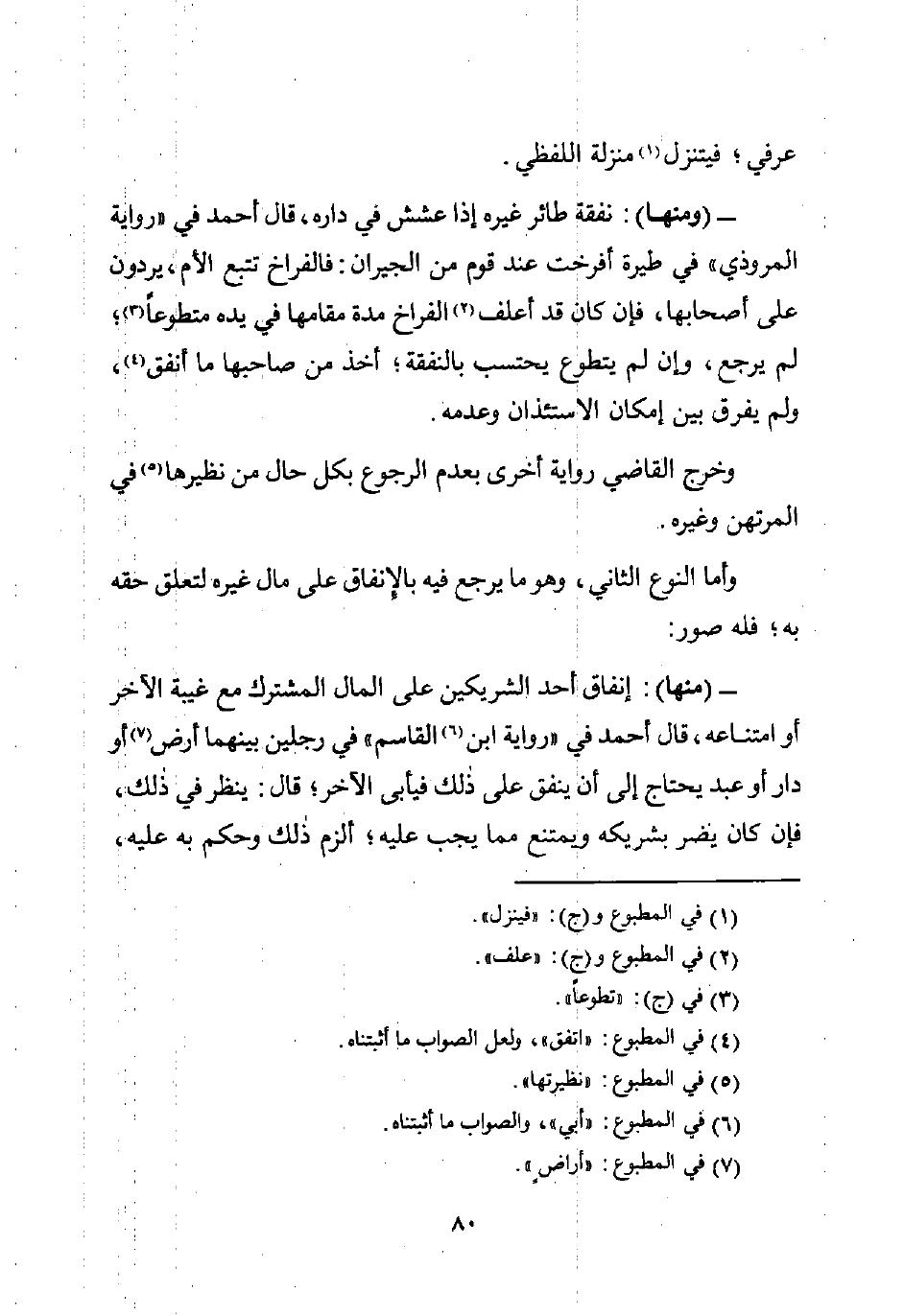 - (منها): إنفاق أحد الشريكين على المال المشترك مع غيبة الآخر أو امتناعه، قال أحمد في "رواية ابن (¬6) القاسم" في رجلين بينهما أرض (¬7) أو دار أو عبد يحتاج إلى أن ينفق على ذلك فيأبى الآخر؛ قال: ينظر في ذلك، فإن كان يضر بشريكه ويمتنع مما يجب عليه؛ ألزم ذلك وحكم به عليه،
