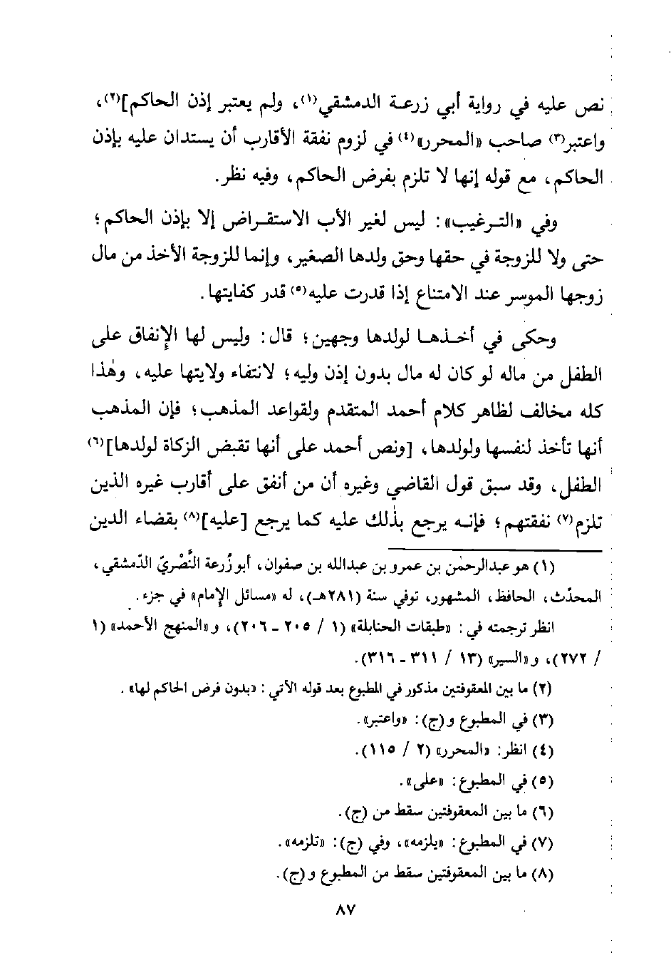 وحكى في أخذها لولدها وجهين؛ قال: وليس لها الإِنفاق على الطفل من ماله لو كان له مال بدون إذن وليه؛ لانتفاء ولايتها عليه، وهذا كله مخالف لظاهر كلام أحمد المتقدم ولقواعد المذهب؛ فإن المذهب أنها تأخذ لنفسها ولولدها، [ونص أحمد على أنها تقبض الزكاة لولدها] (¬6) الطفل، وقد سبق قول القاضي وغيره أن من أنفق على أقارب غيره الذين تلزم (¬7) نفقتهم؛ فإنه يرجع بذلك عليه كما يرجع [عليه] (¬8) بقضاء الدين