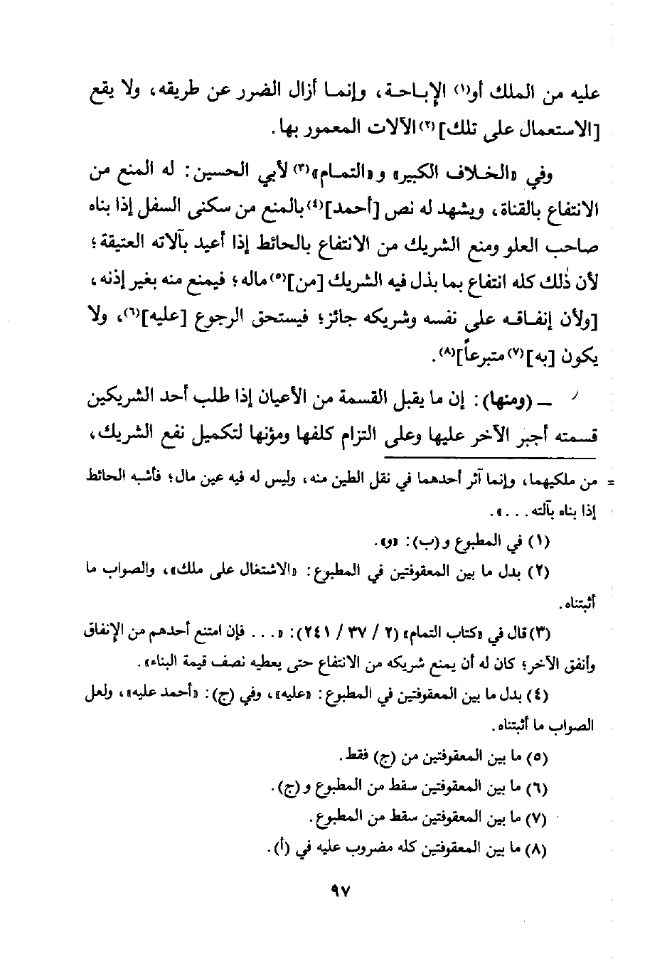 (¬3) قال في "كتاب التمام" (2/ 37/ 241): ". . . فإن امتنع أحدهم من الإِنفاق وأنفق الآخر؛ كان له أن يمنع شريكه من الانتفاع حتى يعطيه نصف قيمة البناء".