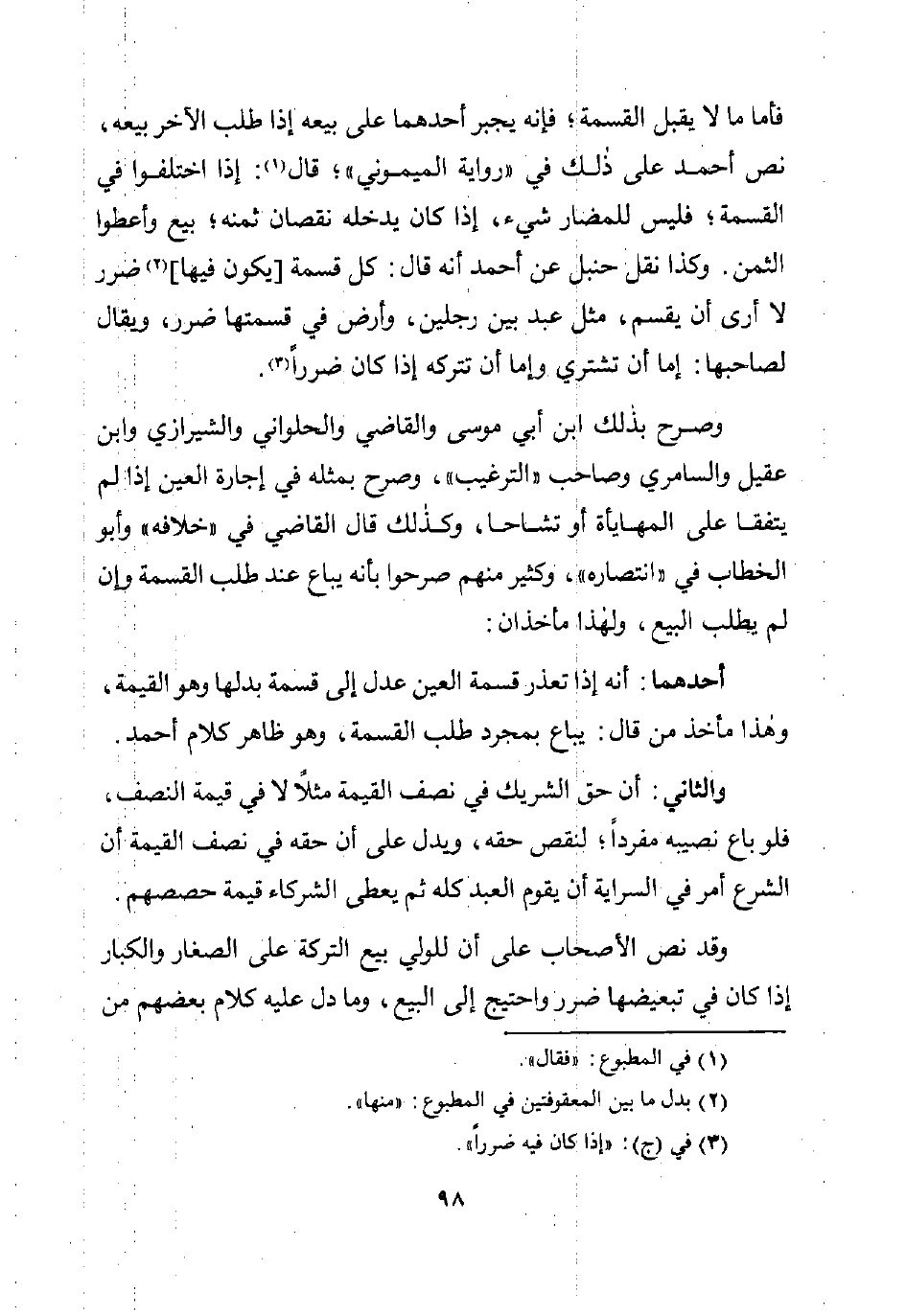 فأما ما لا يقبل القسمة؛ فإنه يجبر أحدهما على بيعه إذا طلب الآخر بيعه، نص أحمد على ذلك في "رواية الميموني"؛ قال (¬1): إذا اختلفوا في القسمة؛ فليس للمضار شيء، إذا كان يدخله نقصان ثمنه؛ بيع وأعطوا الثمن. وكذا نقل حنبل عن أحمد أنه قال: كل قسمة [يكون فيها] (¬2) ضرر لا أرى أن يقسم، مثل عبد بين رجلين، وأرض في قسمتها ضرر، ويقال لصاحبها: إما أن تشتري وإما أن تتركه إذا كان ضررًا (¬3).