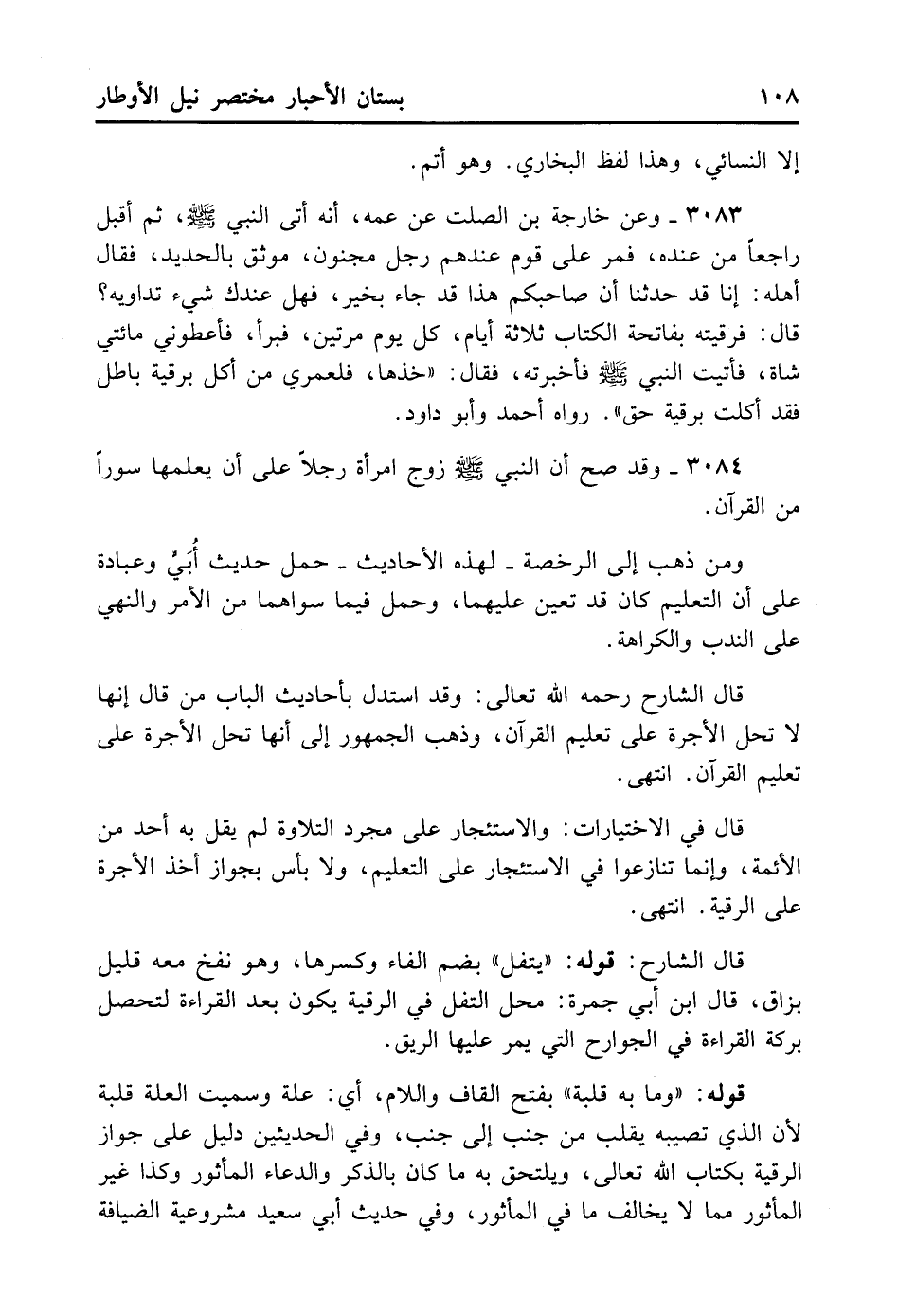 3083- وَعَنْ خَارِجَةَ بْنِ الصَّلْتِ عَنْ عَمِّهِ أَنَّهُ أَتَى النَّبِيَّ - صلى الله عليه وسلم - ثُمَّ أَقْبَلَ رَاجِعًا مِنْ عِنْدِهِ، فَمَرَّ عَلَى قَوْمٍ عِنْدَهُمْ رَجُلٌ مَجْنُونٌ مُوثَقٌ بِالْحَدِيدِ، فَقَالَ أَهْلُهُ: إنَّا قَدْ حُدِّثْنَا أَنَّ صَاحِبَكُمْ هَذَا قَدْ جَاءَ بِخَيْرٍ، فَهَلْ عِنْدَكَ شَيْءٌ تُدَاوِيهِ؟ قَالَ: