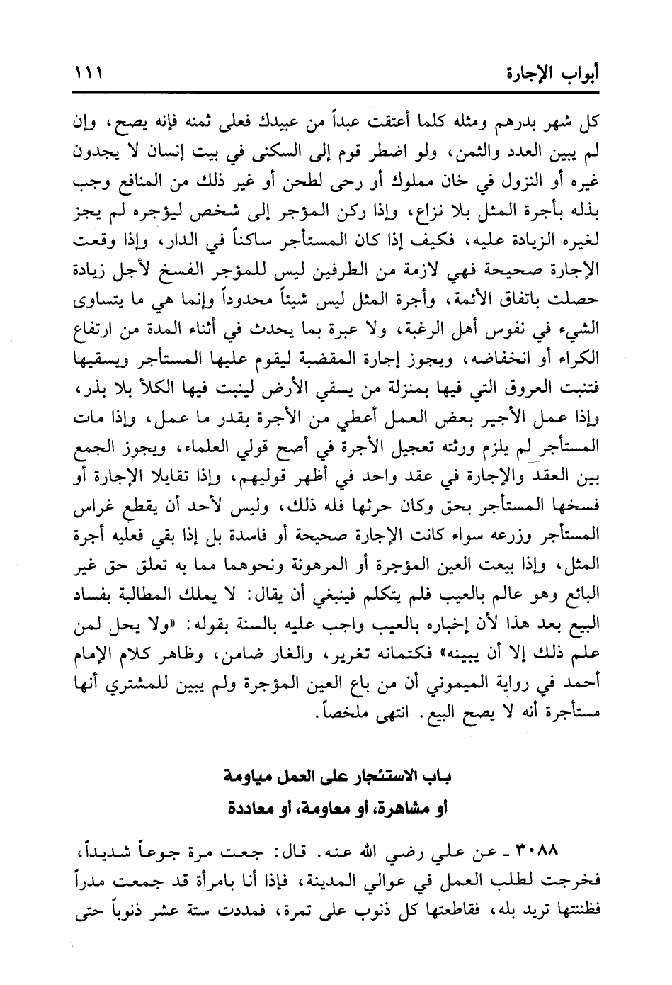 كُلّ شَهْرٍ بِدِرْهَمٍ وَمِثْلَهُ كُلَّمَا أَعْتَقْتَ عَبْدًا مِنْ عَبِيدِكِ فَعَلَى ثَمَنِهِ فَإِنَّهُ يَصِحُّ، وَإِنْ لَمْ يُبَيِّنْ الْعَدَدَ وَالثَّمَنَ، وَلَوْ اضْطَرَّ قَوْمٌ إِلَى السُّكْنَى فِي بَيْتِ إِنْسَانٍ لا يَجِدُونَ غَيْرَهُ أَوْ النُّزُولَ فِي خَانٍ مَمْلُوكٍ أَوْ رَحَى لِطَحْنِ أَوْ غَيْرَ ذَلِكَ مِنَ الْمَنَافِعِ وَجَبَ بَذْلَهُ بِأُجْرَةِ الْمِثْلِ بِلا نِزَاع، وَإِذَا رَكَنَ الْمُؤَجِّرُ إِلَى شَخْصٍ لَيُؤَجِّرَهُ لَمْ يَجُزْ لِغَيْرِهِ الزِّيَادَةَ عَلَيْهِ، فَكَيْفَ إِذَا كَانَ الْمُسْتَأْجِرُ سَاكِنًا فِي الدَّارِ، وَإِذَا وَقَعَتْ الإِجَارَةُ صَحِيحَة فَهِيَ لازِمَةٌ مِنَ الطَّرَفَيْنِ لَيْسَ لِلْمُؤَجِّرِ الْفَسْخُ لِأَجْلِ زِيَادَة حَصلَتْ بِاتِّفَاقِ الأَئِمَّةِ، وَأُجْرَة الْمَثَلِ لَيْسَ شَيْئًا مَحْدُودًا وَإِنَّمَا هِيَ مَا يَتَسَاوَى الشَّيْء فِي نُفُوسِ أَهْلِ الرَّغْبَةِ، وَلا عِبْرَةَ بِمَا يَحْدُثُ فِي أَثْنَاءِ الْمُدَّةِ مِنَ ارْتِفَاعِ الْكِرَاءِ أَوِ انْخِفَاضِهِ، وَيَجُوزُ إِجَارَة الْمَقْضبةِ لِيَقُومُ عَلَيْهَا الْمُسْتَأْجِرَ وَيَسْقِيهَا فَتَنْبُتُ الْعُرُوقَ الَّتِي فِيهَا بِمَنْزِلَة مَنْ يَسْقِي الأَرْضَ لَيَنْبَتَ فِيهَا الْكَلأَ بِلا بَذْرِ وَإِذَا عَمِلَ لِلأَجِيرِ بَعْضَ الْعَمَلَ أُعْطِيَ مِنَ الأُجْرَةِ بِقَدْرِ مَا عَمِلَ، وَإِذَا مَاتَ الْمُسْتَأْجِرُ لَمْ يَلْزَم وَرَثَتُهُ تَعْجِيلَ الأُجْرَة فِي أَصَحِّ قَوْلَي الْعُلَمَاءِ، وَيَجُوزُ الْجَمْعُ بَيْنَ الْعَقْدِ وَالإِجَارَة فِي عَقْدٍ وَاحِدٍ فِي أَظْهَرِ قَوْلَيْهِمْ، وَإِذَا تَقَايَلا الإِجَارَة أَوْ فَسَخَهَا الْمُسْتَأْجِرُ بِحَقٍ وَكَانَ حَرْثُهَا فَلَهُ ذَلِكَ، وَلَيْسَ لأَحَدٍ أَنْ يَقْطَعَ غِرَاسَ الْمُسْتَأْجِرَ