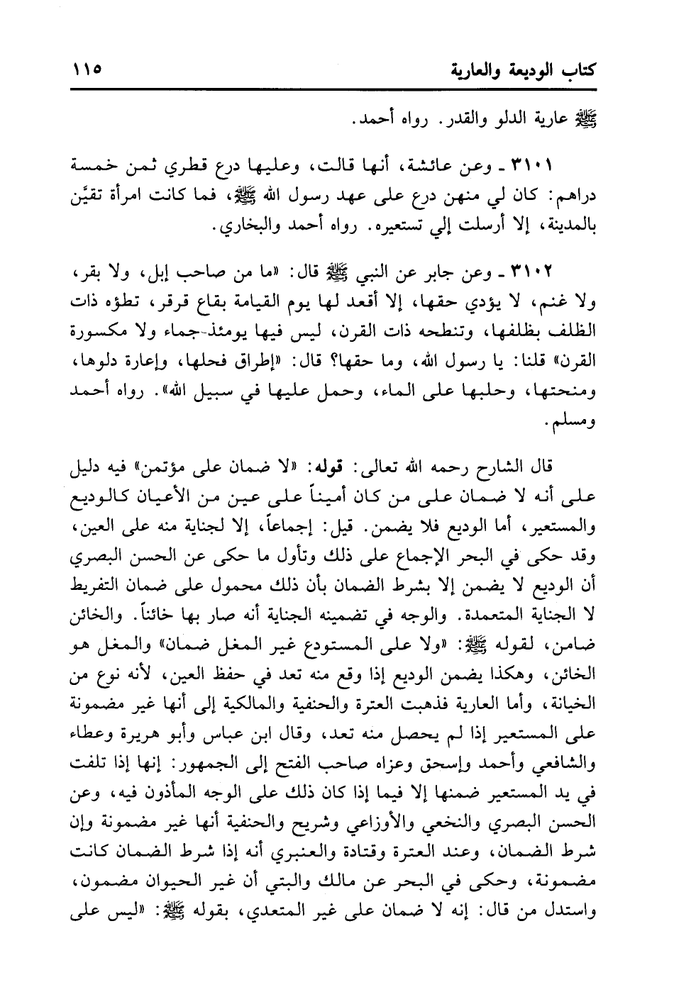 قَالَ الشَّارِحُ رَحِمَهُ اللهُ تَعَالَى: قَوْلُهُ: «لا ضَمَانَ عَلَى مُؤْتَمَنٍ» فِيهِ دَلِيلٌ عَلَى أَنَّهُ لا ضَمَانَ عَلَى مَنْ كَانَ أَمِينًا عَلَى عَيْنٍ مِنْ الأَعْيَانِ كَالْوَدِيعِ وَالْمُسْتَعِيرِ أَمَّا الْوَدِيعُ فَلا يَضْمَنُ قِيلَ: إجْمَاعًا إلا لِجِنَايَةٍ مِنْهُ عَلَى الْعَيْنِ وَقَدْ حُكِيَ فِي الْبَحْرِ الإِجْمَاعُ عَلَى ذَلِكَ، وَتَأَوَّلَ مَا حُكِيَ عَنْ الْحَسَنِ الْبَصْرِيِّ أَنَّ الْوَدِيعَ لا يَضْمَنُ إلا بِشَرْطِ الضَّمَانِ بِأَنَّ ذَلِكَ مَحْمُولٌ عَلَى ضَمَانِ التَّفْرِيطِ لا الْجِنَايَةِ الْمُتَعَمَّدَةِ، وَالْوَجْهُ فِي تَضْمِينِهِ الْجِنَايَةَ أَنَّهُ صَارَ بِهَا خَائِنًا، وَالْخَائِنُ ضَامِنٌ لِقَوْلِهِ - صلى الله عليه وسلم -: «وَلا عَلَى الْمُسْتَوْدَعِ غَيْرِ الْمُغِلِّ ضَمَانٌ» وَالْمُغِلُّ: هُوَ الْخَائِنُ، وَهَكَذَا يَضْمَنُ الْوَدِيعُ إذَا وَقَعَ مِنْهُ تَعَدٍّ فِي حِفْظِ الْعَيْنِ لأَنَّهُ نَوْعٌ مِنْ الْخِيَانَةِ وَأَمَّا الْعَارِيَّةُ فَذَهَبَتْ الْعِتْرَةُ وَالْحَنَفِيَّةُ وَالْمَالِكِيَّةُ إلَى أَنَّهَا غَيْرُ مَضْمُونَةٍ عَلَى الْمُسْتَعِيرِ إذَا لَمْ يَحْصُلْ مِنْهُ تَعَدٍّ. وَقَالَ ابْنُ عَبَّاسٍ وَأَبُو هُرَيْرَةَ وَعَطَاءٌ وَالشَّافِعِيُّ وَأَحْمَدُ وَإِسْحَاقُ وَعَزَاهُ صَاحِبُ الْفَتْحِ إلَى الْجُمْهُورِ: إنَّهَا إذَا تَلِفَتْ فِي يَدِ الْمُسْتَعِيرِ ضَمِنَهَا إلا فِيمَا إذَا كَانَ ذَلِكَ عَلَى الْوَجْهِ الْمَأْذُونِ فِيهِ وَعَنْ الْحَسَنِ الْبَصْرِيِّ وَالنَّخَعِيِّ وَالأَوْزَاعِيِّ وَشُرَيْحٍ وَالْحَنَفِيَّةِ أَنَّهَا غَيْرُ مَضْمُونَةٍ وَإِنْ شُرِطَ الضَّمَانُ