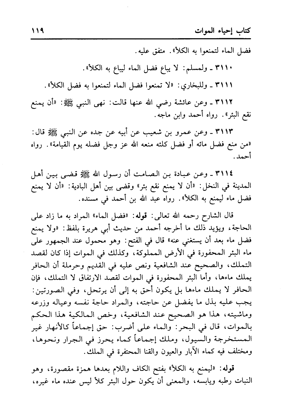 3111- وَلِلْبُخَارِيِّ: «لا تَمْنَعُوا فَضْلَ الْمَاءِ لِتَمْنَعُوا بِهِ فَضْلَ الْكَلَإِ» .