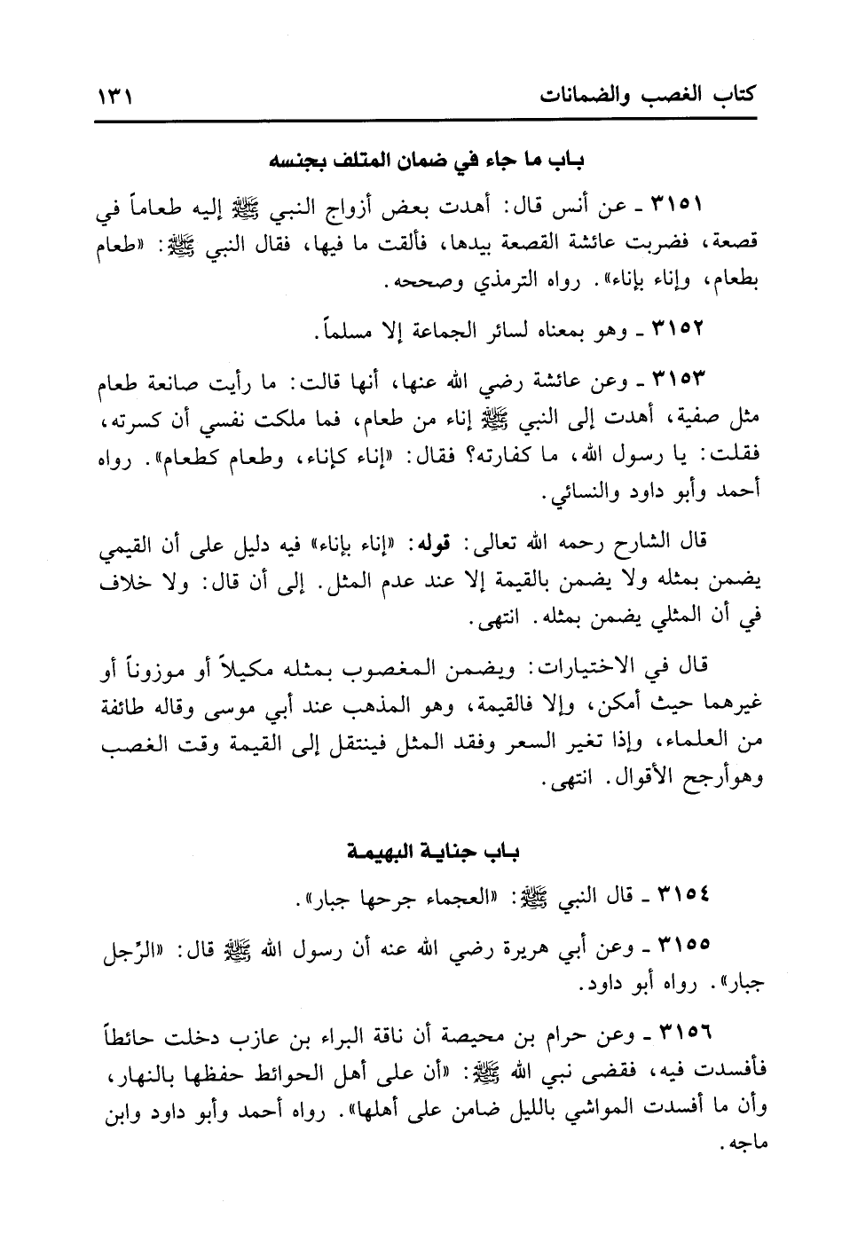 3156- وَعَنْ حَرَامِ بْنِ مُحَيِّصَةُ أَنَّ نَاقَةَ الْبَرَاءِ بْنِ عَازِبٍ دَخَلَتْ حَائِطًا فَأَفْسَدَتْ فِيهِ، فَقَضَى نَبِيُّ اللَّهِ - صلى الله عليه وسلم - أَنَّ عَلَى أَهْلِ الْحَوَائِطِ حِفْظُهَا بِالنَّهَارِ، وَأَنَّ مَا أَفْسَدَتْ الْمَوَاشِي بِاللَّيْلِ ضَامِنٌ عَلَى أَهْلِهَا. رَوَاهُ أَحْمَدُ وَأَبُو دَاوُد وَابْنُ مَاجَةْ.