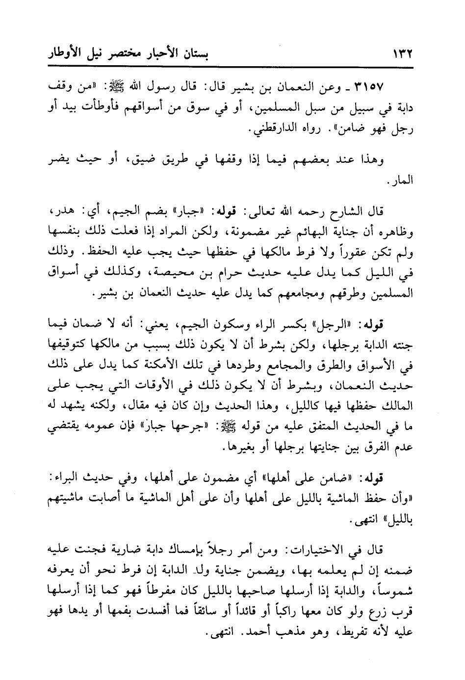 3157- وَعَنْ النُّعْمَانِ بْنِ بَشِيرٍ قَالَ: قَالَ رَسُولُ اللَّهِ - صلى الله عليه وسلم -: «مَنْ وَقَفَ دَابَّةً فِي سَبِيلٍ مِنْ سُبُلِ الْمُسْلِمِينَ أَوْ فِي سُوقٍ مِنْ أَسْوَاقِهِمْ، فَأَوْطَأَتْ بِيَدٍ أَوْ رِجْلٍ فَهُوَ ضَامِنٌ» . رَوَاهُ الدَّارَقُطْنِيّ.