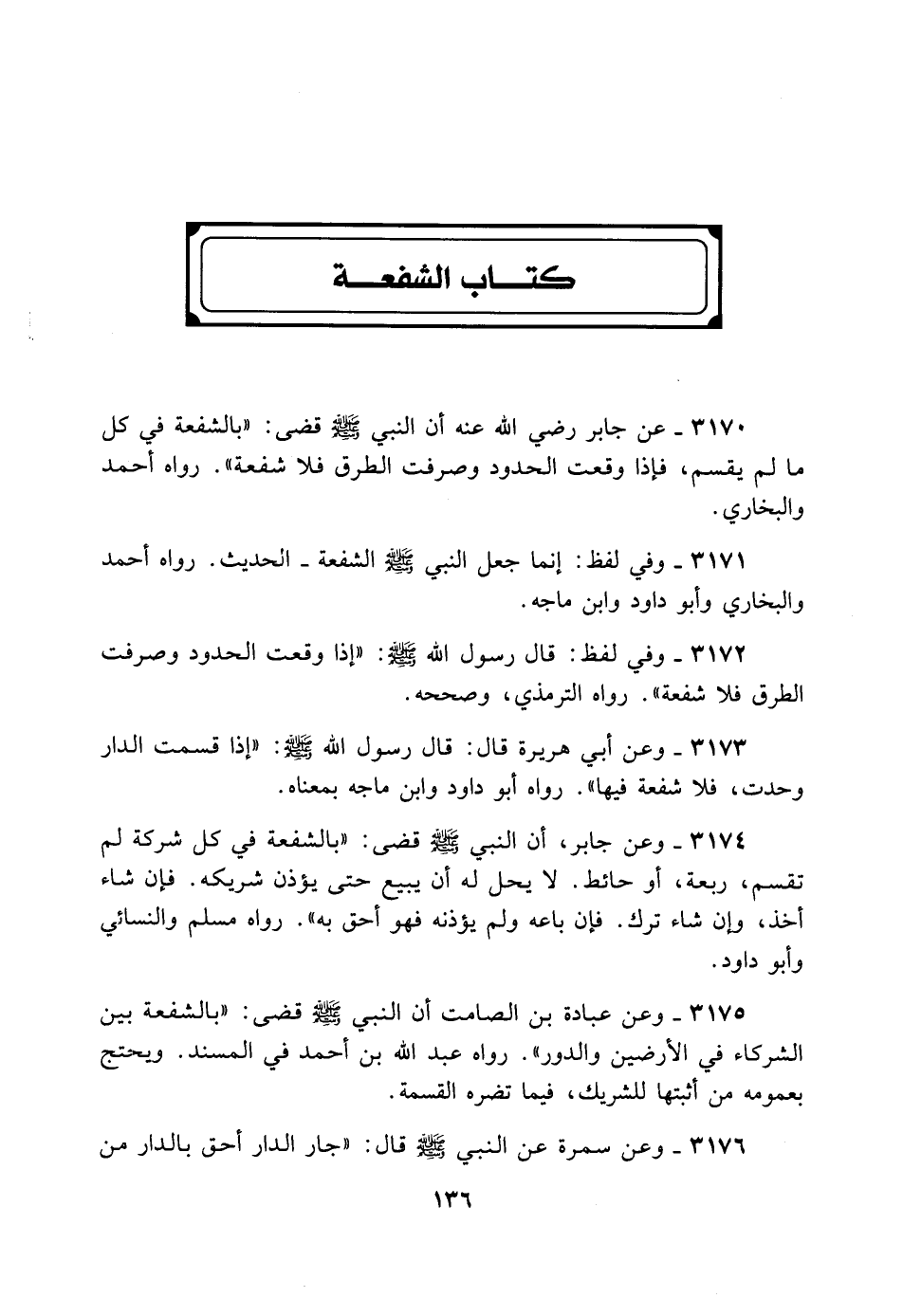 3170- عَنْ جَابِرٍ - رضي الله عنه - أَنَّ النَّبِيَّ - صلى الله عليه وسلم - قَضَى بِالشُّفْعَةِ فِي كُلِّ مَا لَمْ يُقْسَمْ، فَإِذَا وَقَعَتْ الْحُدُودُ وَصُرِفَتْ الطُّرُقُ فَلا شُفْعَةَ. رَوَاهُ أَحْمَدُ وَالْبُخَارِيُّ.
