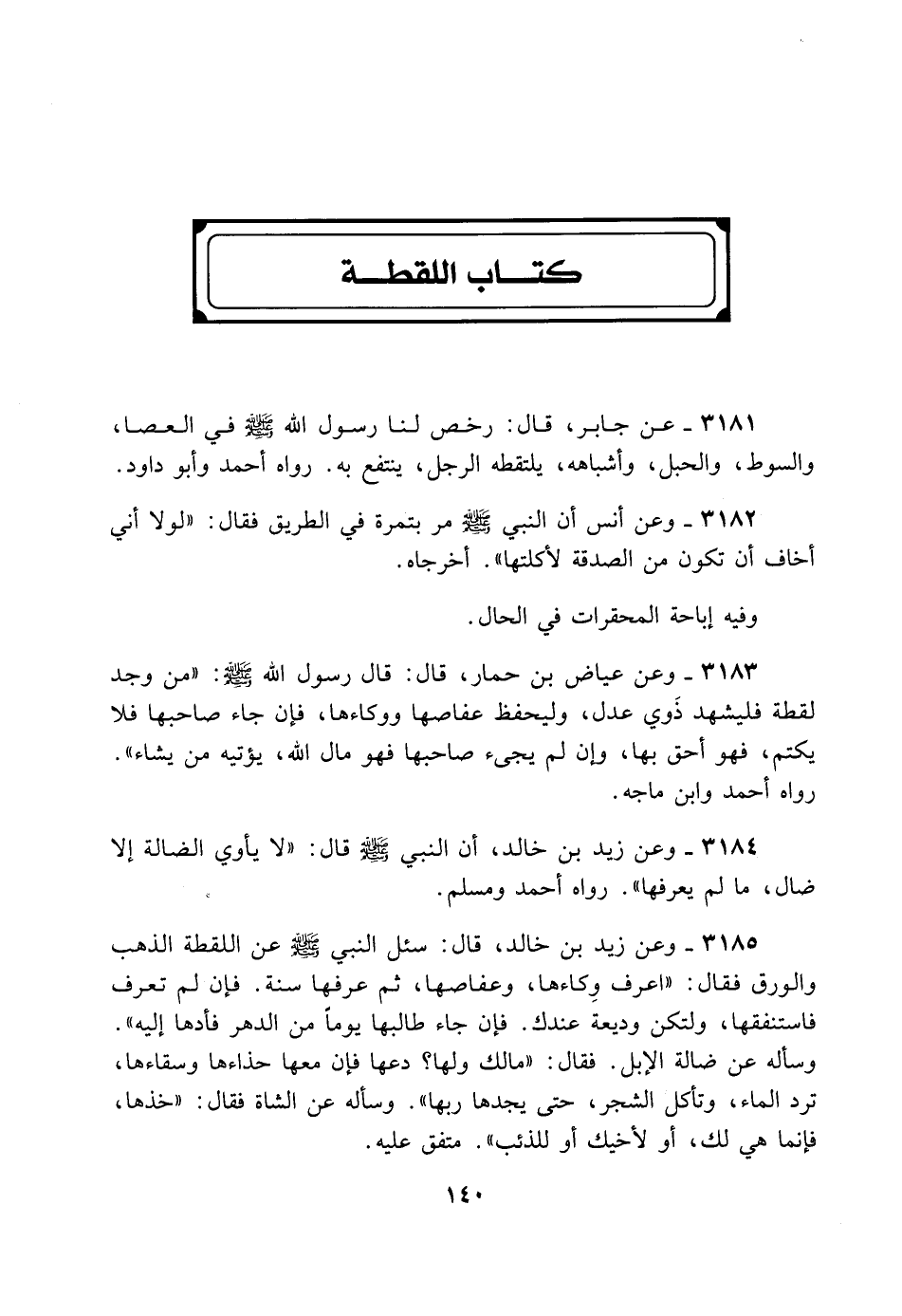 3183- وَعَنْ عِيَاضِ بْنِ حِمَارٍ قَالَ: قَالَ رَسُولُ اللَّهِ - صلى الله عليه وسلم -: «مَنْ وَجَدَ لُقَطَةً فَلْيُشْهِدْ ذَوَيْ عَدْلٍ، أَوْ لِيَحْفَظْ عِفَاصَهَا وَوِكَاءَهَا فَإِنْ جَاءَ صَاحِبُهَا فَلا يَكْتُمْ فَهُوَ أَحَقُّ بِهَا، وَإِنْ لَمْ يَجِئْ صَاحِبُهَا فَهُوَ مَالُ اللَّهِ يُؤْتِيهِ مَنْ يَشَاءُ» . رَوَاهُ أَحْمَدُ وَابْنُ مَاجَةْ.
