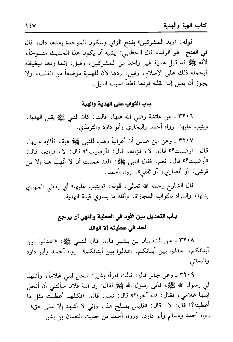 3206- عَنْ عَائِشَةَ رَضِيَ اللهُ عَنْهَا قَالَتْ: كَانَ النَّبِيُّ - صلى الله عليه وسلم - يَقْبَلُ الْهَدِيَّةَ وَيُثِيبُ عَلَيْهَا. رَوَاهُ أَحْمَدُ وَالْبُخَارِيُّ وَأَبُو دَاوُد وَالتِّرْمِذِيُّ.
