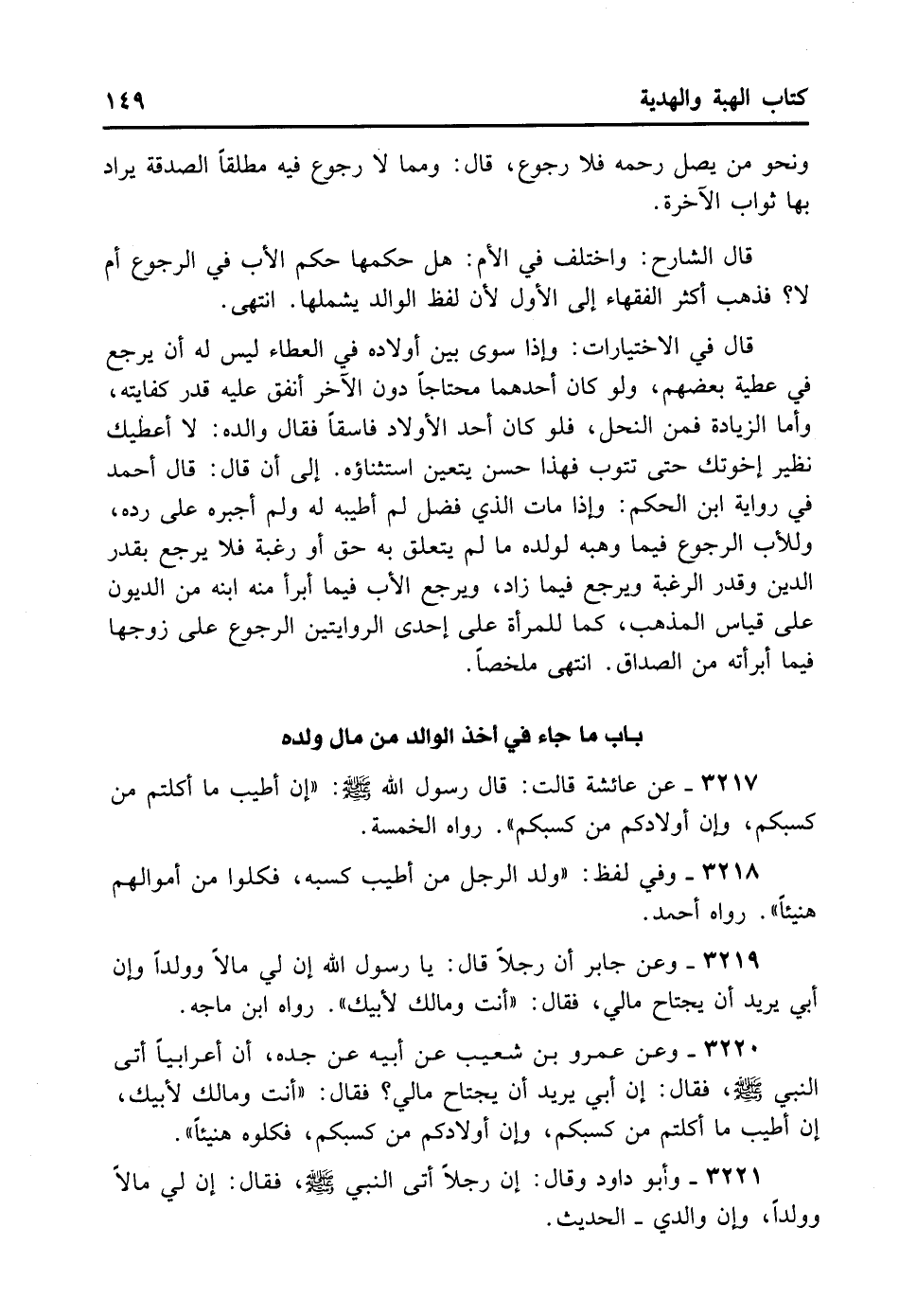 3220- وَعَنْ عَمْرِو بْنِ شُعَيْبٍ عَنْ أَبِيهِ عَنْ جَدِّهِ: أَنَّ أَعْرَابِيًّا أَتَى النَّبِيَّ - صلى الله عليه وسلم - فَقَالَ: إنَّ أَبِي يُرِيدُ أَنْ يَجْتَاحَ مَالِي، فَقَالَ: «أَنْتَ وَمَالُك لِوَالِدِك، إنَّ أَطْيَبَ مَا أَكَلْتُمْ مِنْ كَسْبِكُمْ، وَإِنَّ أَوْلادَكُمْ مِنْ كَسْبِكُمْ فَكُلُوهُ هَنِيئًا» .