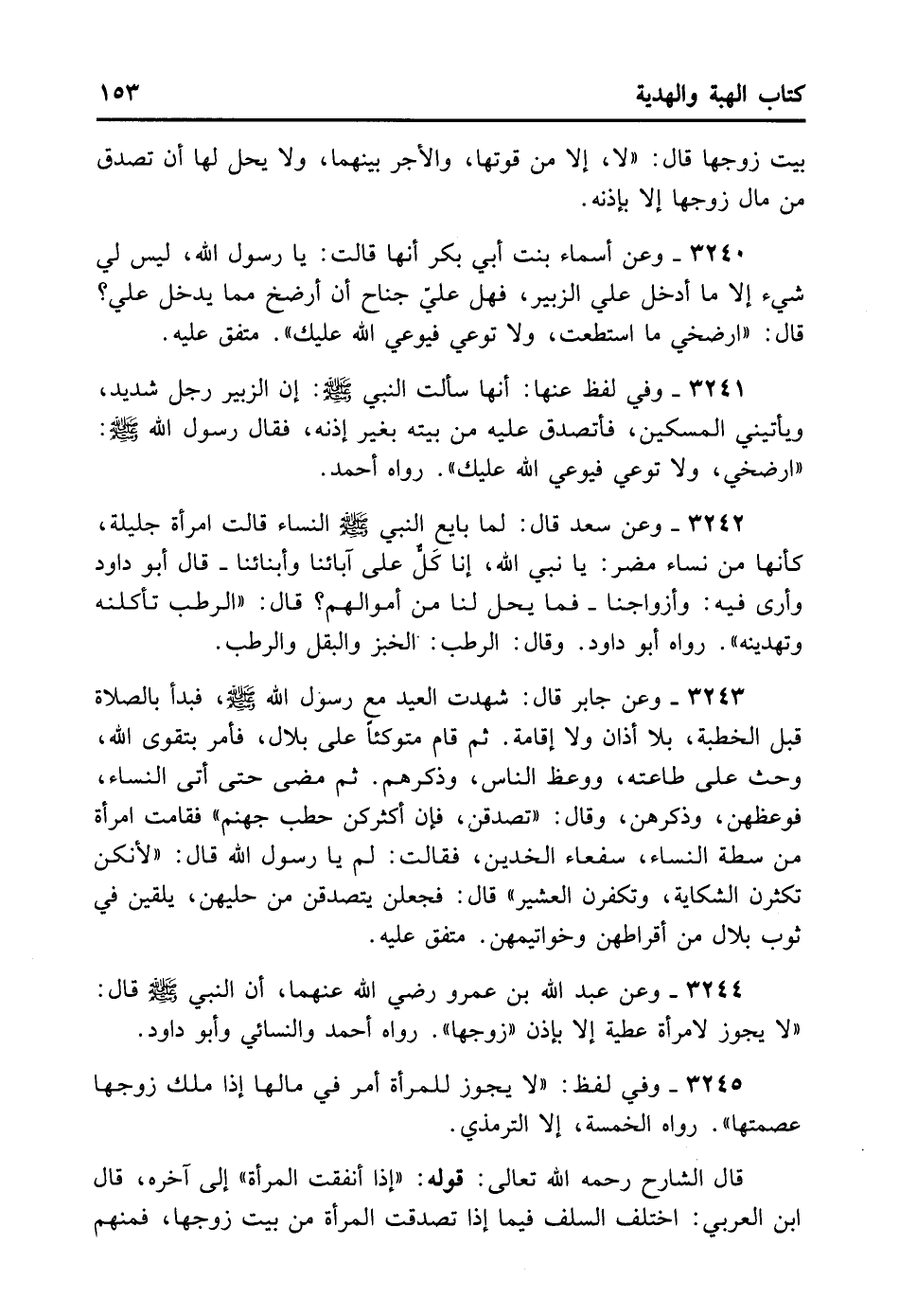 3244- وَعَنْ عَبْدِ اللَّهِ بْنِ عَمْرٍو رَضِيَ اللهُ عَنْهُمَا أَنَّ النَّبِيَّ - صلى الله عليه وسلم - قَالَ: «لا يَجُوزُ لِامْرَأَةٍ عَطِيَّةٌ إلا بِإِذْنِ زَوْجِهَا» . رَوَاهُ أَحْمَدُ وَالنَّسَائِيُّ وَأَبُو دَاوُد.