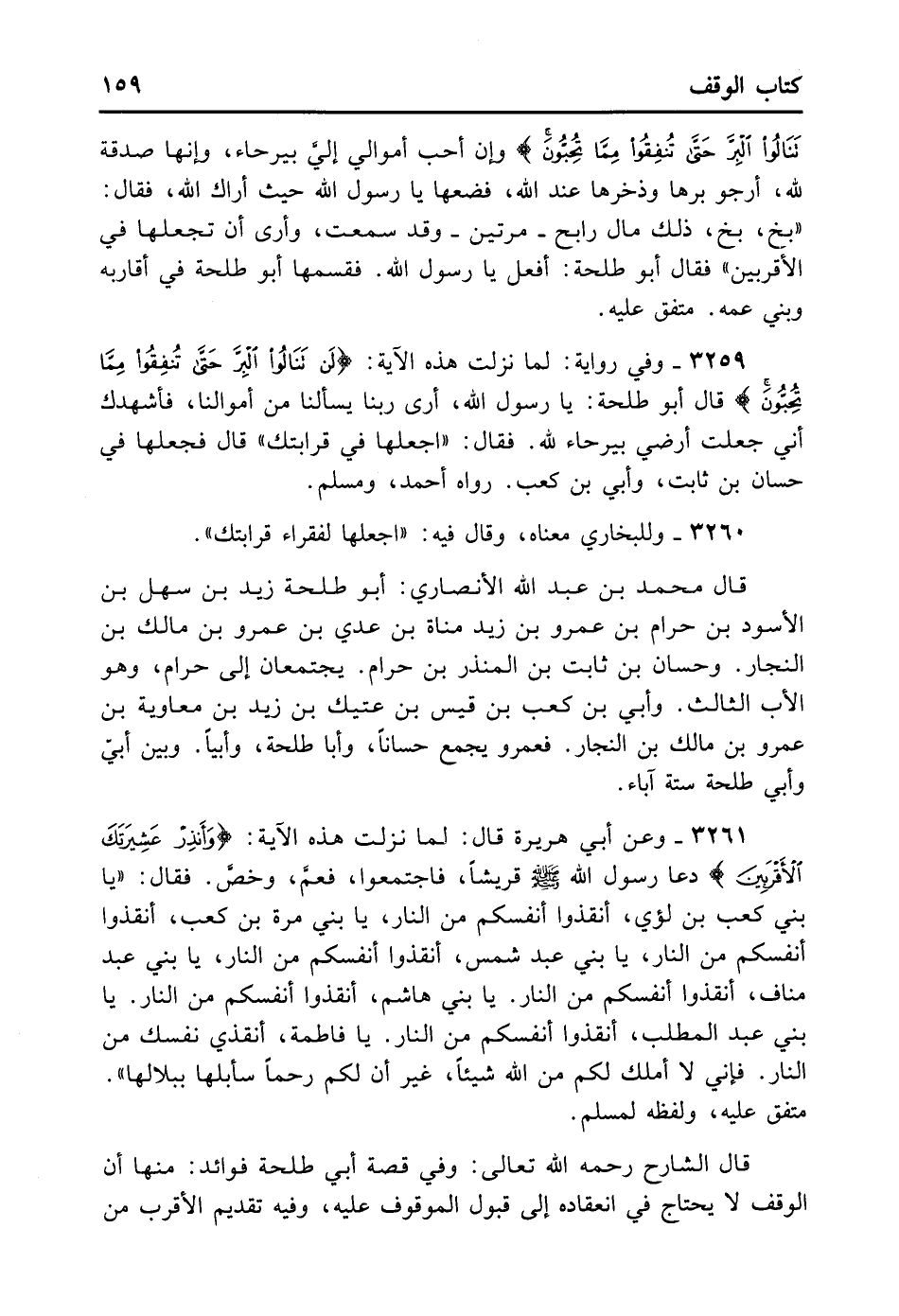 3259- وَفِي رِوَايَةٍ: لَمَّا نَزَلَتْ هَذِهِ الآيَةُ {لَنْ تَنَالُوا الْبِرَّ حَتَّى تُنْفِقُوا مِمَّا تُحِبُّونَ} قَالَ أَبُو طَلْحَةَ: يَا رَسُولَ اللَّهِ أَرَى رَبَّنَا يَسْأَلُنَا مِنْ أَمْوَالِنَا فَأُشْهِدُك أَنِّي جَعَلْت أَرْضِي بَيْرَحَاءَ لِلَّهِ، فَقَالَ: «اجْعَلْهَا فِي قَرَابَتِك» . قَالَ فَجَعَلَهَا فِي حَسَّانَ بْنِ ثَابِتٍ وَأُبَيُّ بْنِ كَعْبٍ. رَوَاهُ أَحْمَدُ وَمُسْلِمٌ.