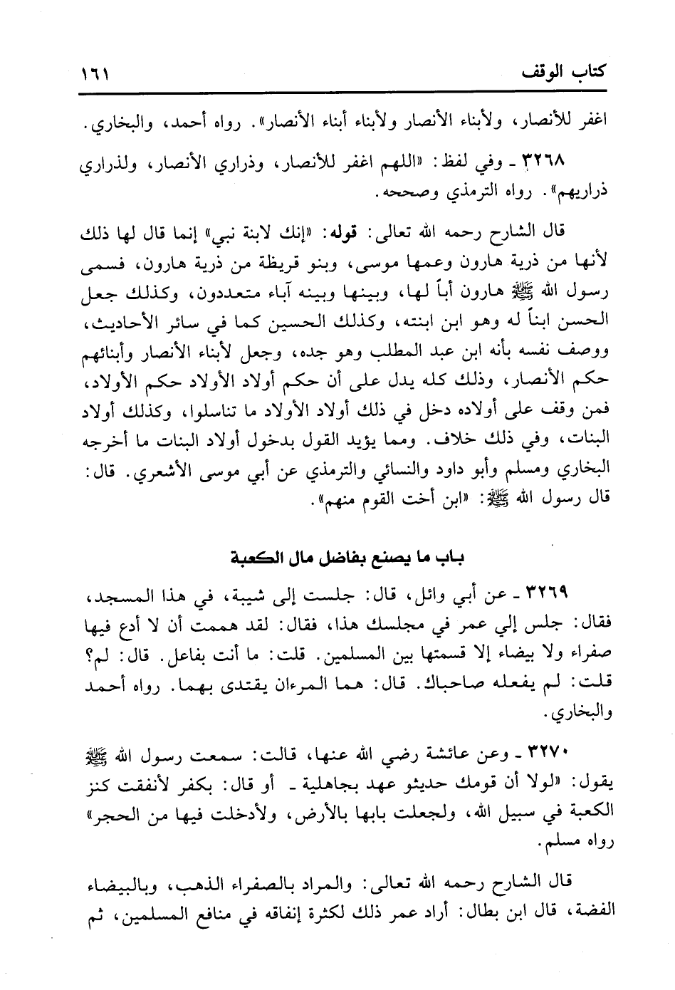 3269- عَنْ أَبِي وَائِلٍ قَالَ: جَلَسْت إلَى شَيْبَةَ فِي هَذَا الْمَسْجِدِ فَقَالَ: جَلَسَ إلَيَّ عُمَرُ فِي مَجْلِسِك هَذَا، فَقَالَ: لَقَدْ هَمَمْت أَنْ لا أَدَعَ فِيهَا صَفْرَاءَ وَلا بَيْضَاءَ إلا قَسَمْتهَا بَيْنَ الْمُسْلِمِينَ، قُلْت: مَا أَنْتَ بِفَاعِلٍ؟ قَالَ: لِمَ؟ قُلْت: لَمْ يَفْعَلْهُ صَاحِبَاك، فَقَالَ: هُمَا الْمَرْءَانِ يُقْتَدَى بِهِمَا. رَوَاهُ أَحْمَدُ وَالْبُخَارِيُّ.