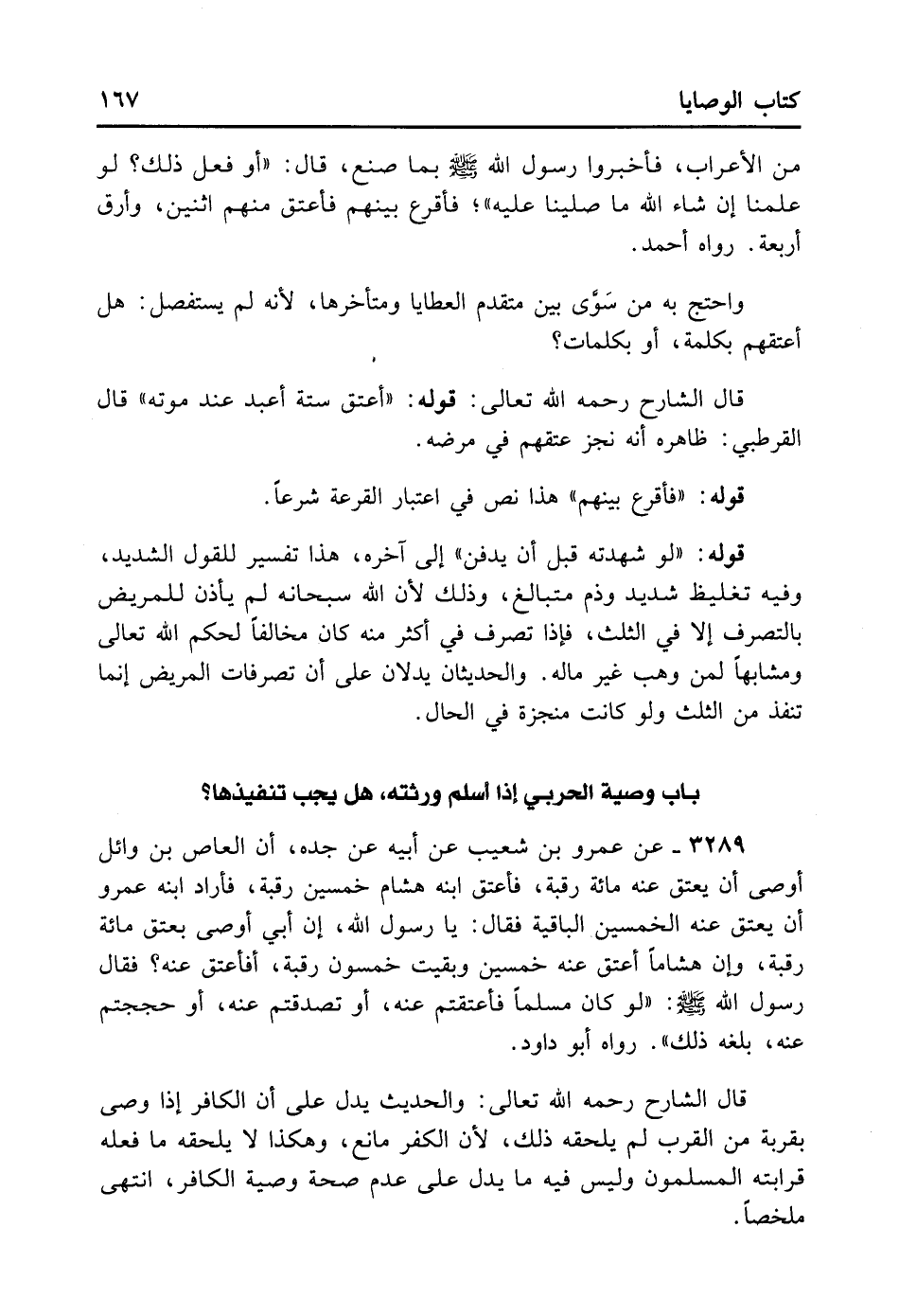3289- عَنْ عَمْرِو بْنِ شُعَيْبٍ عَنْ أَبِيهِ عَنْ جَدِّهِ: أَنَّ الْعَاصِ بْنَ وَائِلٍ أَوْصَى أَنْ يَعْتِقَ عَنْهُ مِائَةُ رَقَبَةٍ، فَأَعْتَقَ ابْنُهُ هِشَامٌ خَمْسِينَ رَقَبَةً، فَأَرَادَ ابْنُهُ عَمْرٌو أَنْ يَعْتِقَ عَنْهُ الْخَمْسِينَ الْبَاقِيَةَ، فَقَالَ: يَا رَسُولَ اللَّهِ: إنَّ أَبِي أَوْصَى بِعِتْقِ مِائَةِ رَقَبَةٍ، وَإِنَّ هِشَامًا أَعْتَقَ عَنْهُ خَمْسِينَ رَقَبَةً وَبَقِيَتْ خَمْسُونَ رَقَبَةً، أَفَأَعْتِقُ عَنْهُ؟ فَقَالَ رَسُولُ اللَّهِ - صلى الله عليه وسلم -: «لَوْ كَانَ مُسْلِمًا فَأَعْتَقْتُمْ عَنْهُ أَوْ تَصَدَّقْتُمْ عَنْهُ أَوْ حَجَجْتُمْ عَنْهُ بَلغهُ ذَلِكَ» . رَوَاهُ أَبُو دَاوُد.