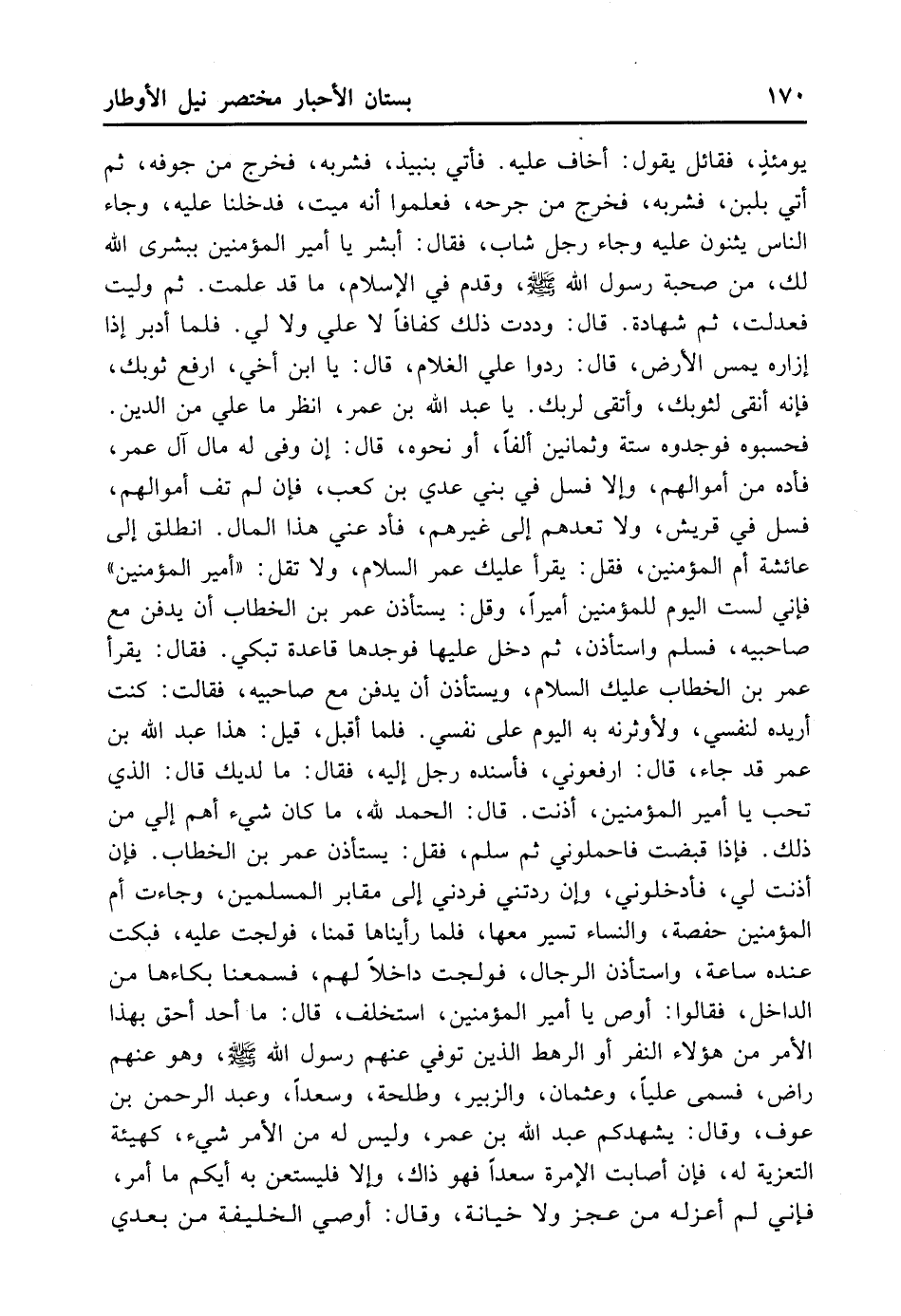 : كُنْتُ أُرِيدُهُ لِنَفْسِي، وَلَأُوثِرَنَّهُ بِهِ الْيَوْمَ عَلَى نَفَسِي؛ فَلَمَّا أَقْبَلَ قِيلَ: هَذَا عَبْدُ اللَّهِ بْنُ عُمَرَ قَدْ جَاءَ، قَالَ: ارْفَعُونِي، فَأَسْنَدَهُ رَجُلٌ إلَيْهِ فَقَالَ: مَا لَدَيْك؟ قَالَ: الَّذِي تُحِبُّ يَا أَمِيرَ الْمُؤْمِنِينَ، أَذِنَتْ. قَالَ: الْحَمْدُ لِلَّهِ مَا كَانَ شَيْءٌ أَهَمَّ إلَيَّ مِنْ ذَلِكَ، فَإِذَا قُبِضْت فَاحْمِلُونِي، ثُمَّ سَلِّمْ فَقُلْ: يَسْتَأْذِنُ عُمَرُ بْنُ الْخَطَّابِ، فَإِنْ أَذِنَتْ لِي فَأَدْخِلُونِي، وَإِنْ رَدَّتْنِي فَرُدُّونِي إلَى مَقَابِرِ الْمُسْلِمِينَ؛ وَجَاءَتْ أُمُّ الْمُؤْمِنِينَ حَفْصَةُ وَالنِّسَاءُ تَسِيرُ تَتْبَعُهَا؛ فَلَمَّا رَأَيْنَاهَا قُمْنَا، فَوَلَجَتْ عَلَيْهِ فَبَكَتْ عِنْدَهُ سَاعَةً، وَاسْتَأْذَنَ الرِّجَالُ فَوَلَجَتْ دَاخِلًا لَهُمْ، فَسَمِعْنَا بُكَاءَهَا مِنْ الدَّاخِلِ، فَقَالُوا: أَوْصِ يَا أَمِيرَ الْمُؤْمِنِينَ، اسْتَخْلِفْ، فَقَالَ: مَا أَجِدُ أَحَقَّ بِهَذَا الأَمْرِ مِنْ هَؤُلاءِ النَّفَرِ أَوْ الرَّهْطِ الَّذِينَ تُوُفِّيَ رَسُولُ اللَّهِ - صلى الله عليه وسلم - وَهُوَ عَنْهُمْ رَاضٍ فَسَمَّى عَلِيًّا وَعُثْمَانَ وَالزُّبَيْرَ وَطَلْحَةَ وَسَعْدًا وَعَبْدَ الرَّحْمَنِ وَقَالَ: يَشْهَدُكُمْ عَبْدُ اللَّهِ بْنُ عُمَرَ وَلَيْسَ لَهُ مِنْ الأَمْرِ شَيْءٌ، كَهَيْئَةِ التَّعْزِيَةِ لَهُ، فَإِنْ أَصَابَتْ الإِمْرَةُ سَعْدًا فَهُوَ ذَاكَ. وَإِلا فَلْيَسْتَعِنْ بِهِ أَيُّكُمْ مَا أُمِّرَ، فَإِنِّي لَمْ أَعْزِلْهُ مِنْ عَجْزٍ وَلا خِيَانَةٍ. وَقَالَ: أُوصِي الْخَلِيفَةَ مِنْ بَعْدِي