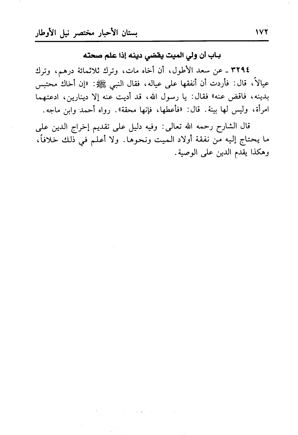 3294- عَنْ سَعْدٍ الأَطْوَلِ: أَنَّ أَخَاهُ مَاتَ وَتَرَكَ ثَلاثَ مِائَةِ دِرْهَمٍ وَتَرَكَ عِيَالًا، قَالَ: فَأَرَدْتُ أَنْ أُنْفِقَهَا عَلَى عِيَالِهِ، فَقَالَ النَّبِيُّ - صلى الله عليه وسلم -: «إنَّ أَخَاكَ مُحْتَبِسٌ بِدَيْنِهِ فَاقْضِ عَنْهُ» . فَقَالَ: يَا رَسُولَ اللَّهِ قَدْ أَدَّيْتُ عَنْهُ إلا دِينَارَيْنِ