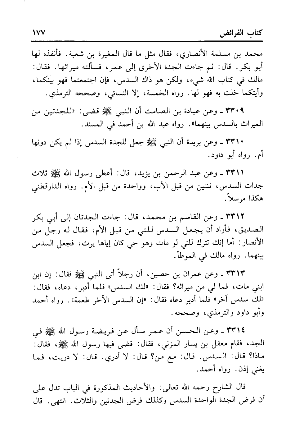 3311- وَعَنْ عَبْدِ الرَّحْمَنِ بْنِ يَزِيدَ قَالَ: أَعْطَى رَسُولُ اللَّهِ - صلى الله عليه وسلم - ثَلاثَ جَدَّاتٍ السُّدُسَ: ثِنْتَيْنِ مِنْ قِبَلِ الأَبِ، وَوَاحِدَةٌ مِنْ قِبَلِ الأُمِّ. رَوَاهُ الدَّارَقُطْنِيّ هَكَذَا مُرْسَلًا.